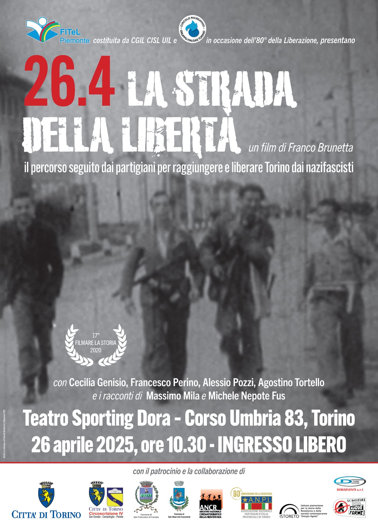 Anche il Comune di San Maurizio Canavese patrocina la proiezione di “26.4. La strada della libertà”, il docufilm del nostro concittadino Franco Brunetta che racconta di quando i partigiani scesero a liberare Torino nell'aprile 1945. Prodotto dalla Bottega delle Nuove Forme con il sostegno del Comune di San Maurizio Canavese, dell'Anpi locale e della famiglia Tuscano nell'ambito del progetto "75 anni dopo - Celebriamo la libertà!", nel 2020 vinse il premio “25 aprile” nella sezione speciale Videomaker della diciassettesima edizione del Concorso cinematografico nazionale “Filmare la Storia” coordinato dall’Archivio nazionale cinematografico della Resistenza e dal Polo del '900.