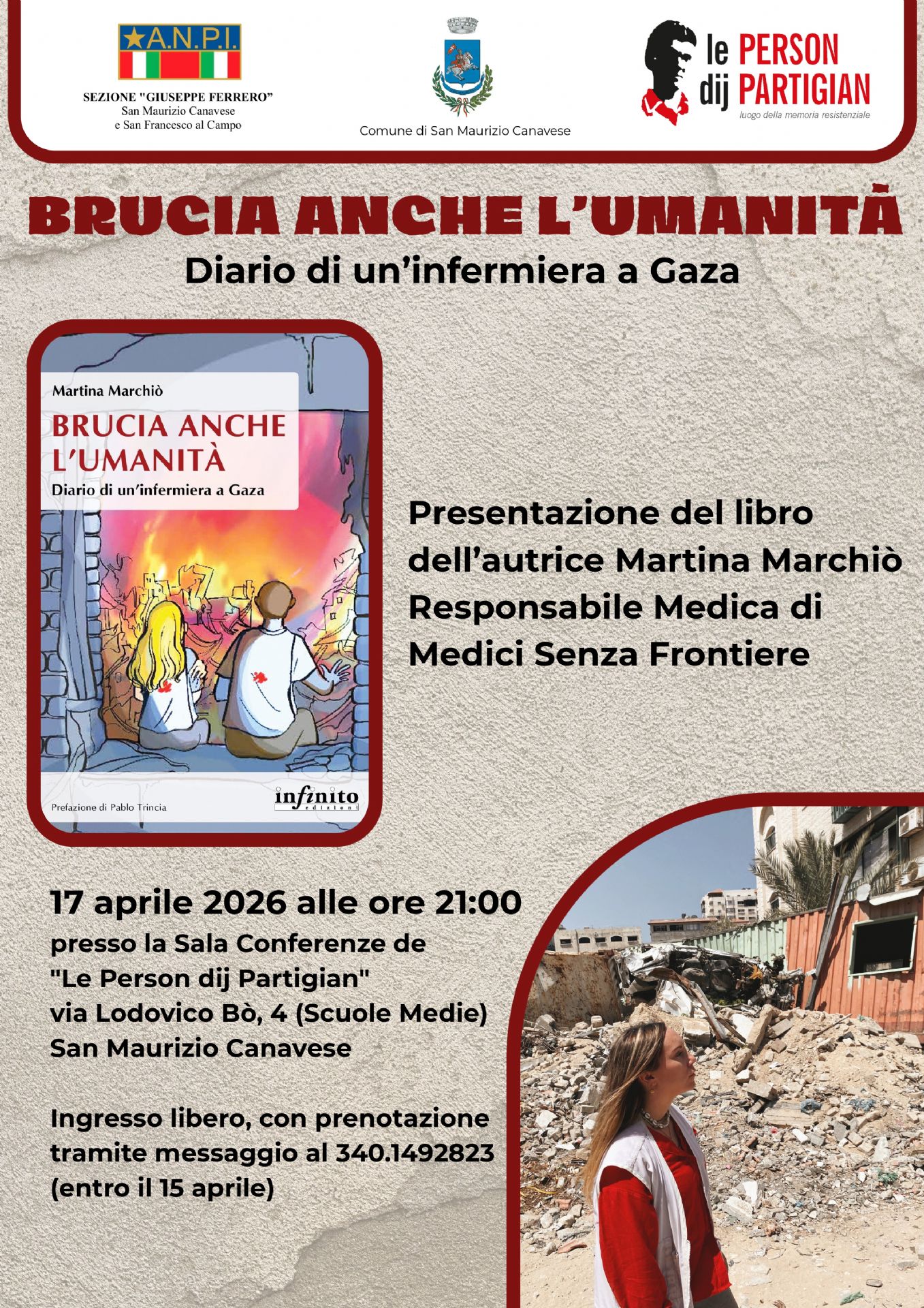 Venerdì 17 aprile alle ore 21 le Person dij Partigian (via Bò, 4) ospiteranno la presentazione di "Brucia anche l'umanità - Diario di un'infermiera a Gaza", di Martina Marchiò, responsabile medica di Medici Senza Frontiere.