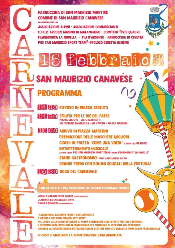 Sarà domenica 15 febbraio, quest'anno, il giorno del nostro grande Carnevale, organizzato dalla parrocchia di San Maurizio Martire e dal Comune, in collaborazione con Alpini, Associazione Commercianti, CSCR Arcozzi Masino di Malanghero, Comitato Teste Quadre, Filarmonica La Novella, Fili d'Argento, Parrocchia di Ceretta, Pgs San Maurizio Sport Team, Pro loco Ceretta Insieme.