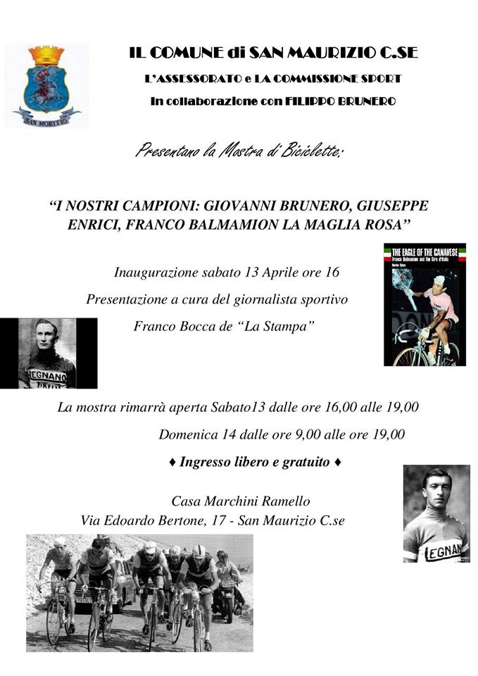Si svolgerà regolarmente questo fine settimana (nonostante il rinvio della fiera Dolce Fiore alla quale era abbinata) la speciale mostra dedicata ai “grandi” del passato del nostro territorio, oraganizzata dall'Assessorato allo Sport e dalla Commissione Sport, in collaborazione con Filippo Brunero. “I nostri campioni: Giovanni Brunero, Giuseppe Enrici, Franco Balmamion e la maglia rosa” - questo il titolo della mostra, che esporrà biciclette, pubblicazioni, cimeli dei tre grandi ciclisti – sarà inaugurata a Casa Marchini Ramello, in via Bertone 17, sabato 13 aprile alle ore 16 e resterà aperta fino alle 19. Domenica 14, apertura continuativa dalle 9 alle 19. L'ingresso è libero e gratuito.