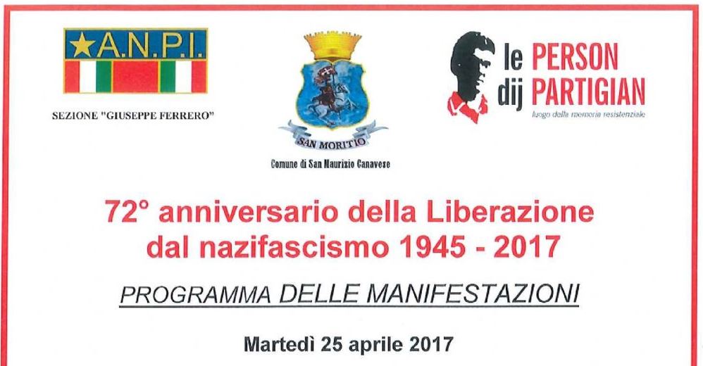 Martedì 25 aprile, il Comune di San Maurizio Canavese e la locale sezione ANPI “Giuseppe Ferrero” celebreranno il 72° anniversario della Liberazione. Il ritrovo sarà alle ore 9,30 davanti al municipio. Seguiranno il corteo, con la sosta e l'omaggio alle “pietre della Libertà” dei Caduti civili e partigiani, la messa presso la Chiesa Vecchia del cimitero e le orazioni del sindaco Paolo Biavati e di un rappresentante dell'ANPI. Nel pomeriggio, dalle 15 alle 17, sarà possibile visitare “Le Person dij Partigian”, in via Lodovico Bò 4. Alle ore 18, nella sala conferenze delle “Person” andrà in scena “Cent – Storia di un comandante partigiano”, spettacolo teatrale a cura dell'ANPI di Mezzenile. Le celebrazioni proseguiranno la settimana successiva, martedì 2 maggio, alle ore 9,30, con la “Passeggiata della Libertà”, quando i ragazzi delle scuole medie saranno guidati nei luoghi del paese che videro il passaggio dei Tedeschi in ritirata, per commemorare il 1° maggio 1945, giorno della effettiva liberazione di San Maurizio Canavese.