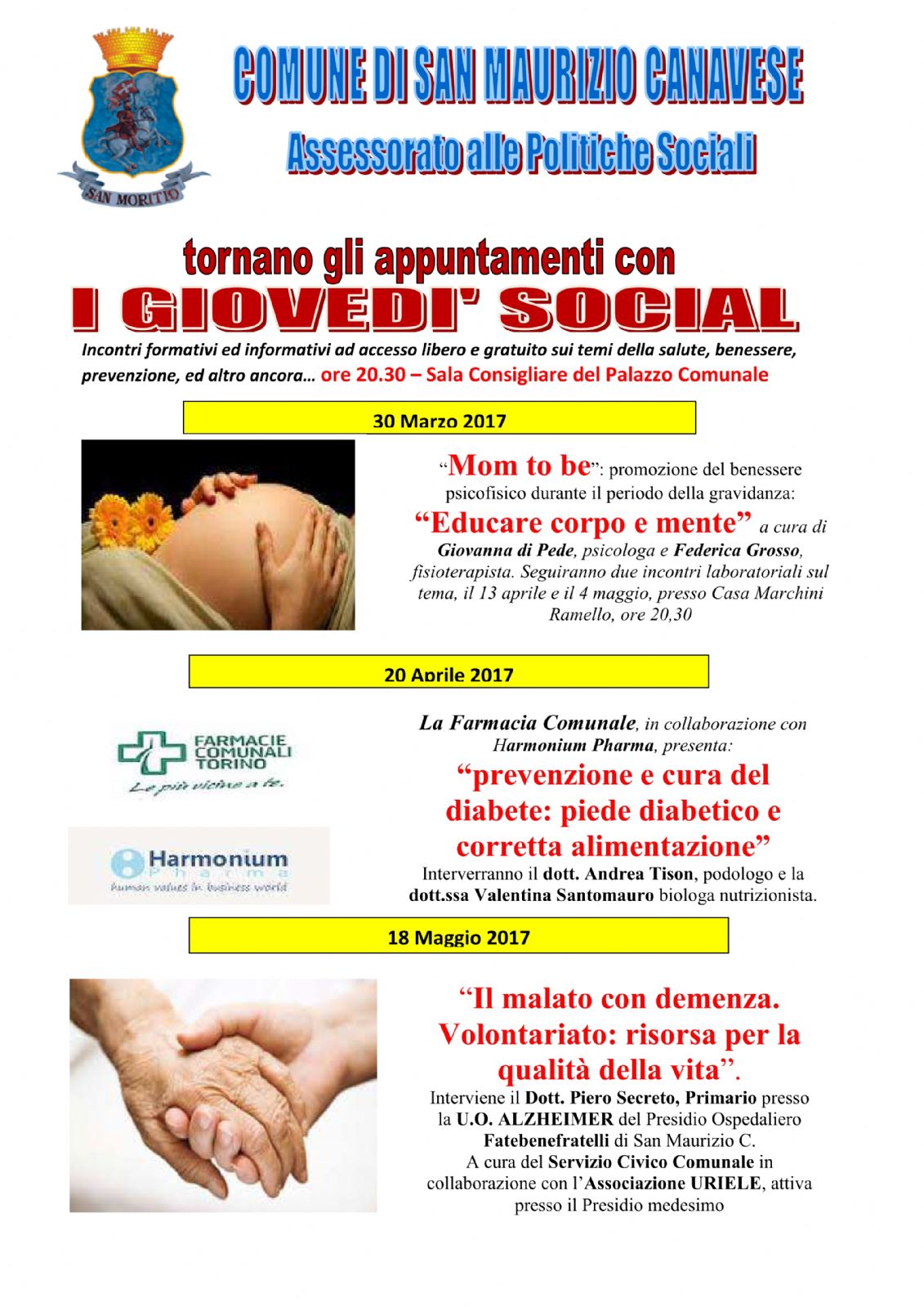 Tornano anche quest'anno i “Giovedì Social” organizzati dall'Assessorato alle Politiche Sociali del Comune di San Maurizio Canavese. Si tratta di un'interessante rassegna di incontri di carattere formativo e informativo – gratuiti e aperti a tutti – su temi particolarmente importanti e delicati, come la salute, il benessere e la prevenzione.