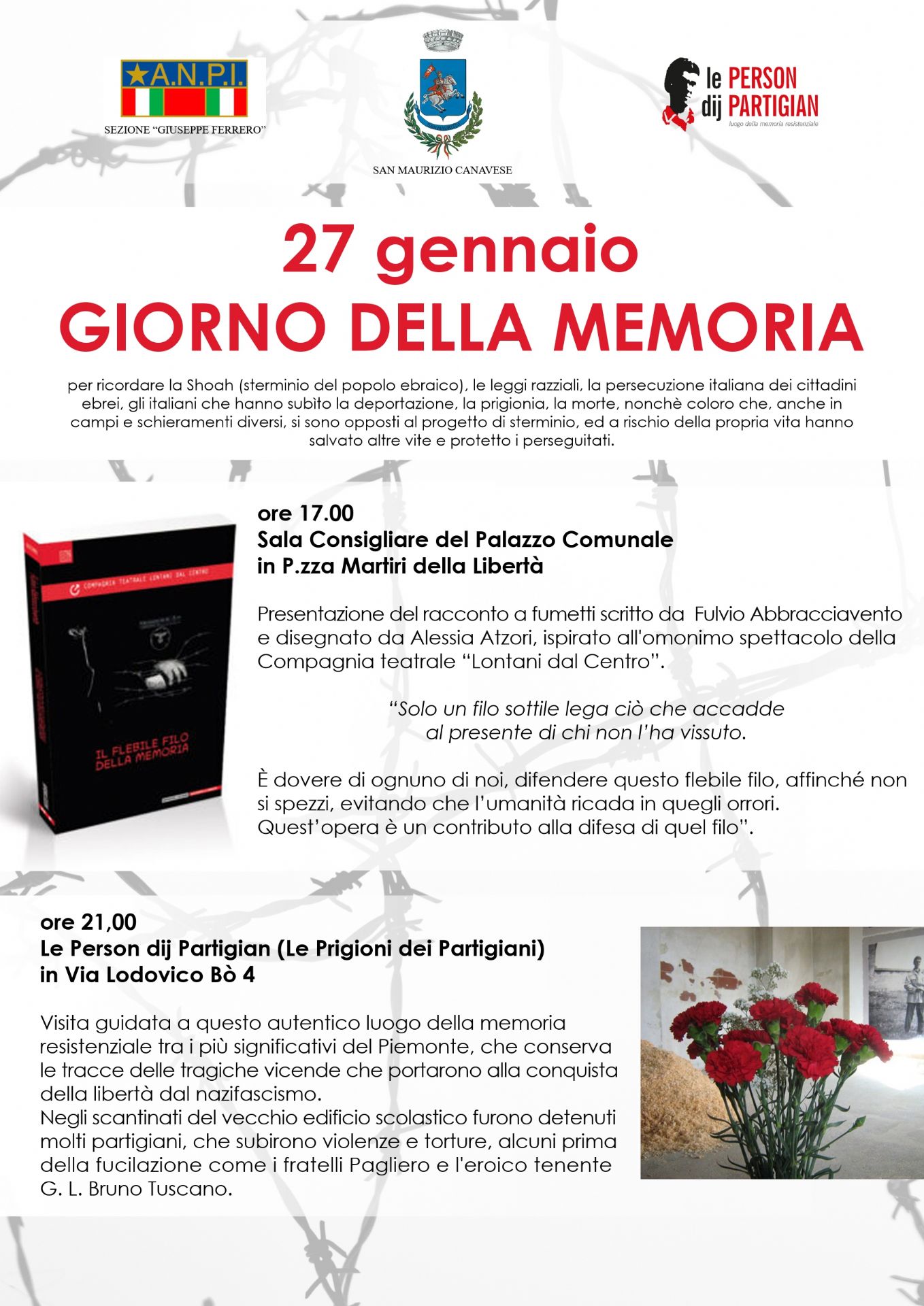 Anche il Comune di San Maurizio Canavese onorerà il Giorno della Memoria, sabato 27 gennaio, con un doppio appuntamento: alle ore 17 per la presentazione del racconto a fumetti scritto da Fulvio Abbracciavento e disegnato da Alessia Atzori, ispirato all'omonimo spettacolo della Compagnia teatrale “Lontani dal Centro”; e alle ore 21 in via Bo 4, con la visita guidata alle Person dij Partigian.