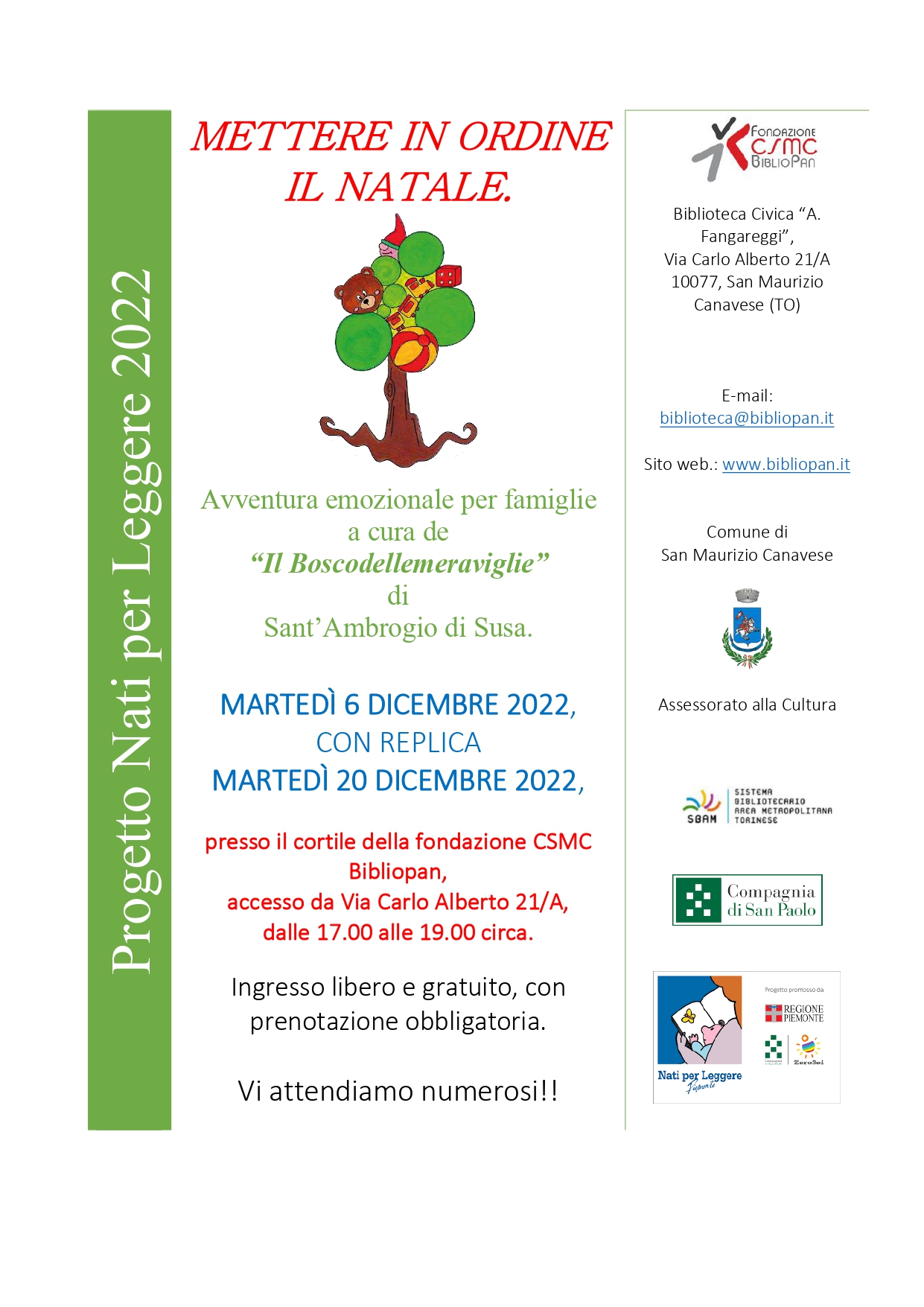 Se occorresse un pizzico di magia per dare un nuovo impulso all’atmosfera natalizia? E se la Biblioteca Civica di San Maurizio Canavese potesse dare un contributo grazie ad un alleato straordinario? E chi mai, se non il Folletto Sam, potrebbe aiutare tutti noi a “Mettere in ordine il Natale”? Ed è proprio “Mettere in ordine il Natale” il titolo dell’Avventura emozionale che si svolgerà nel cortile e nei locali della Fondazione Bibliopan martedì 6 dicembre 2022, con replica prevista per martedì 20 dicembre 2022, dalle 17 alle 19 circa.