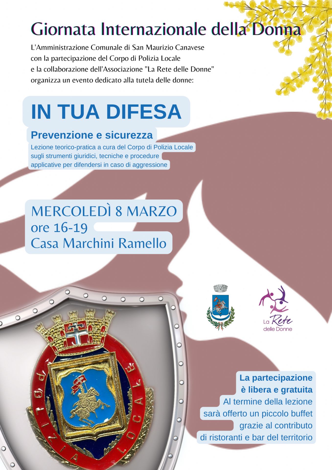con la partecipazione del corpo di Polizia Locale e la collaborazione dell'associazione "La Rete delle Donne", organizza "In tua difesa - Prevenzione e sicurezza", lezione teorico-pratica a cura della Polizia Locale su strumenti giuridici, tecniche e procedure applicative per difendersi in caso di aggressione. L'appuntamento è per mercoledì 8 marzo, dalle 16 alle 19, a Casa Marchini Ramello (via Bertone 17).