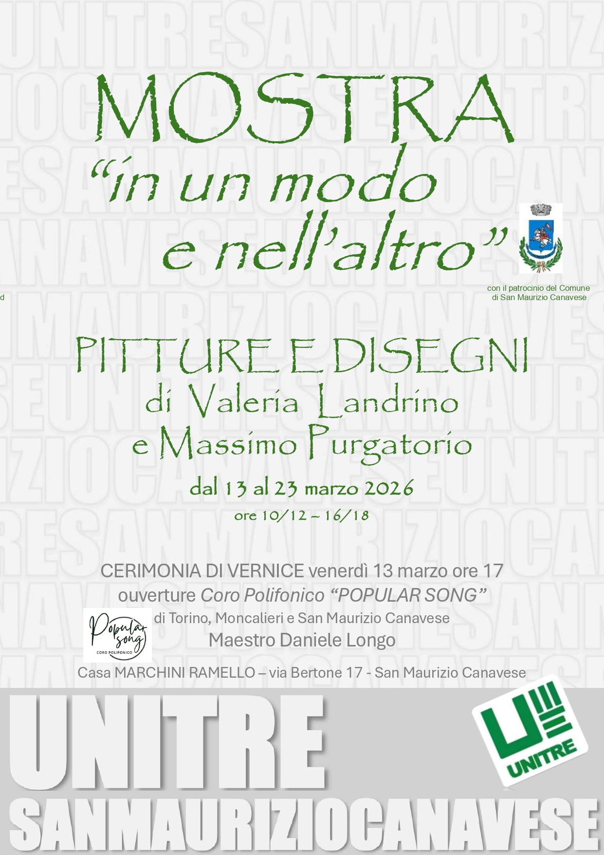 L'Unitre di San Maurizio Canavese, con il patrocinio del Comune, ci invita alla mostra "In un modo e nell'altro", pitture e disegni di Valeria Landrino e Massimo Purgatorio, allestita a Casa Marchini Ramello (via Bertone, 17).