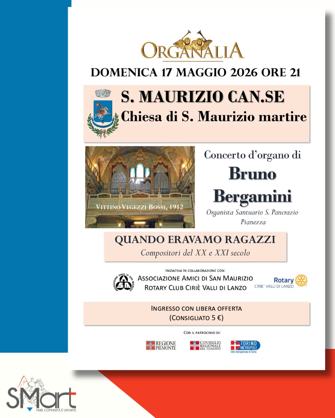 Domenica 17 maggio alle ore 21 nella chiesa parrocchiale di San Maurizio Martire: "Quando eravamo ragazzi", concerto d'organo di Bruno Bergamini, organista del santuario di San Pancrazio a Pianezza, con musiche di compositori del XX e del XXI secolo.