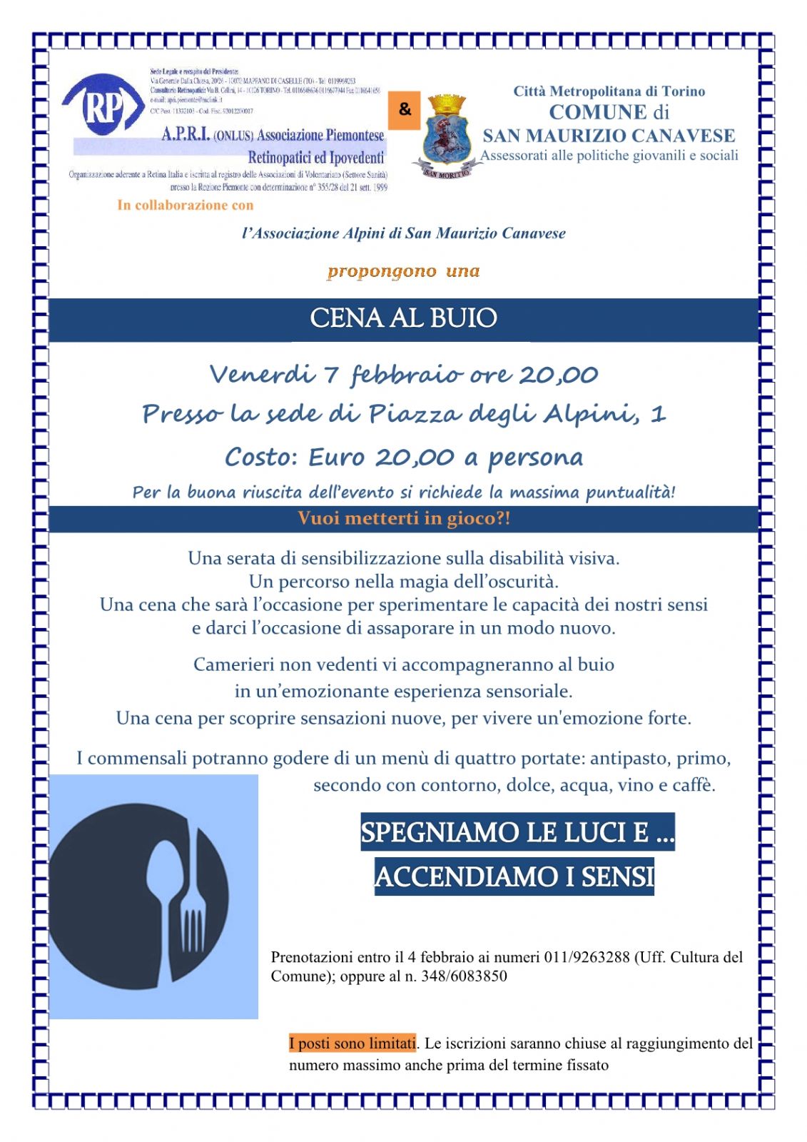 È originale e decisamente "forte", la proposta che il Comune di San Maurizio Canavese fa ai propri cittadini: gli assessorati alle Politiche Giovanili e alle Politiche Sociali, insieme all'A.P.R.I. (Associazione Piemontese Retinopatici e Ipovedenti) e in collaborazione con l'Associazione Alpini, invitano i sanmauriziesi a partecipare alla Cena al Buio che si terrà venerdì 7 febbraio alle ore 20 nella sede degli Alpini (piazza degli Alpini, 1).