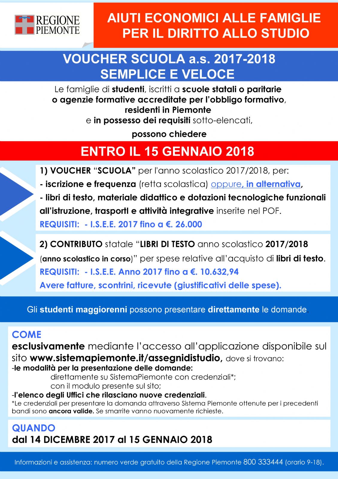 Per tutte le informazioni sui criteri di accesso e sulle modalità di presentazione delle domande, potete collegarvi all'indirizzo http://www.regione.piemonte.it/istruzione/voucher_17_18.htm