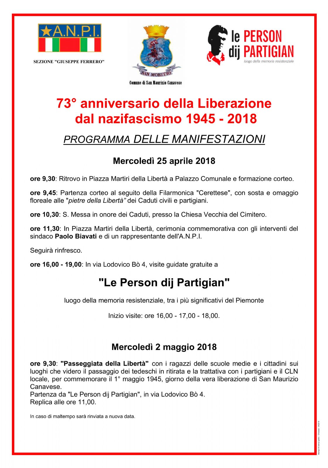 Mercoledì 25 aprile, celebrazione del 73° anniversario della Liberazione. Il ritrovo è alle ore 9.30 di fronte al municipio. Seguirà il corteo con l'omaggio alle “pietre della Libertà”. Alle 10.30, la messa nella Chiesa Vecchia del cimitero. Alle 11.30, di fronte al municipio, la cerimonia commemorativa, con il saluto del sindaco Paolo Biavati.