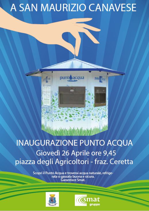 Sarà inaugurato giovedì 26 aprile, alle ore 9.45, il distributore SMAT di acqua naturale e frizzante della frazione Ceretta, in piazza degli Agricoltori. Invitiamo alla cerimonia d'inaugurazione tutti i cittadini che avranno voglia di brindare insieme a noi (naturalmente con un bicchiere di acqua fresca e pura, mentre per chi sarà in vena di strafare ci sarà addirittura dell'acqua frizzante...) alla nuova “Casetta dell'acqua”. Oltre ai rappresentanti di SMAT e dell'Amministrazione comunale, parteciperanno alla piccola cerimonia due classi della scuola primaria di Ceretta, che in queste settimane, per l'occasione, sono anche stati coinvolti in un interessante progetto didattico sull'importanza dell'acqua e del suo uso corretto.