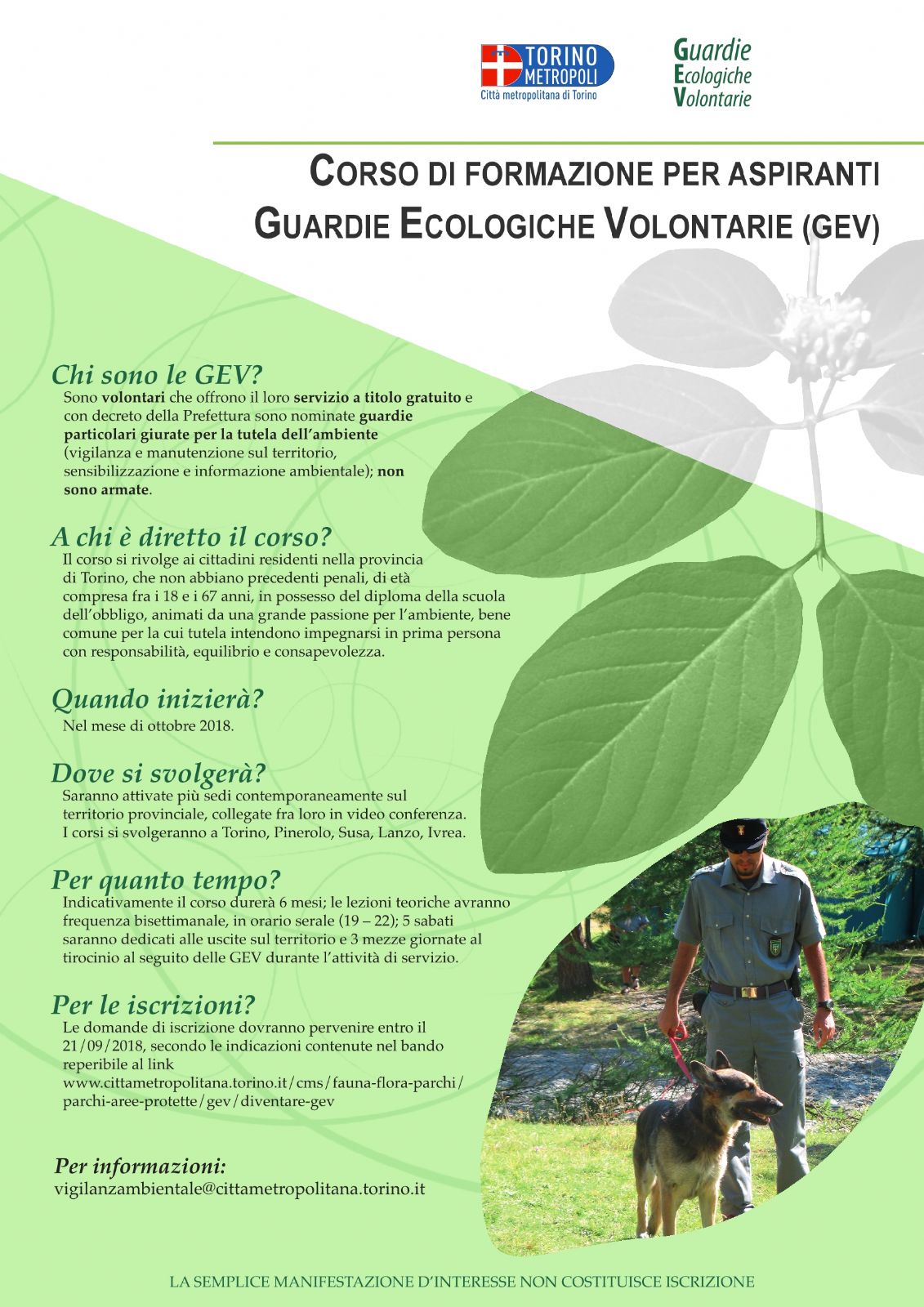 Partirà nel prossimo mese di ottobre il corso di formazione per aspiranti Guardie Ecologiche Volontarie organizzato dalla Città Metropolitana di Torino (per consultare il bando completo: http://www.cittametropolitana.torino.it/cms/risorse/natura/dwd/pdf/aree_protette/gev/corso/BandoCorsoGev2018.pdf).