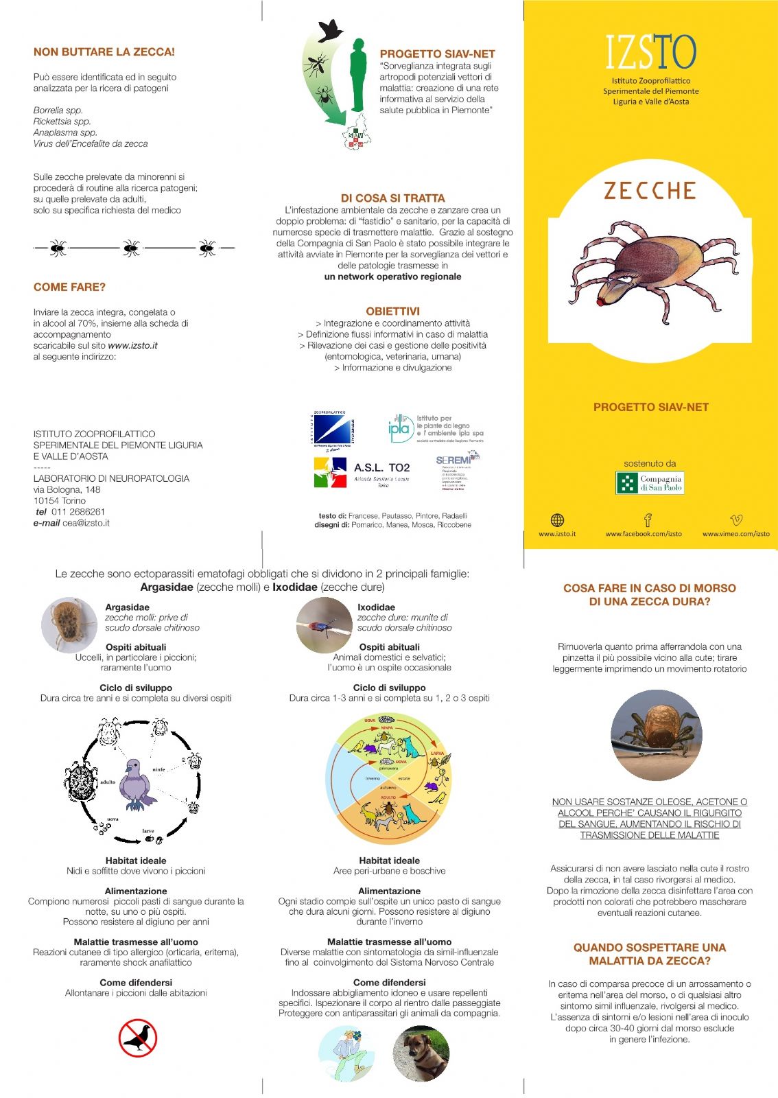 In seguito alle ripetute segnalazioni pervenute in merito alla presenza di zecche sul territorio, l’Istituto Zooprofilattico Sperimentale del Piemonte, Liguria e Valle d’Aosta ha infatti realizzato un pieghevole – che alleghiamo in immagine – nel quale sono indicati alcuni comportamenti da adottare, con una breve descrizione dei due tipi di zecche e l'indicazione, per ciascuna, degli ospiti abituali, del ciclo di sviluppo, dell’habitat ideale, dell'alimentazione, delle malattie malattie trasmesse all’uomo e delle azioni da intraprendere per difendersi.