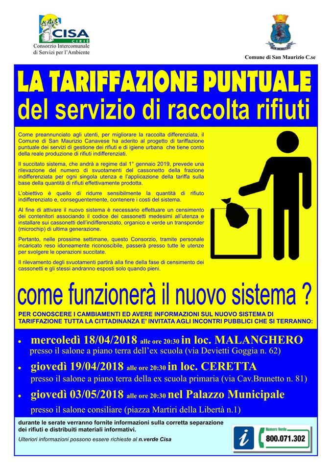 Questa sera, mercoledì 18 aprile, si svolgerà a Malanghero il primo dei tre incontri che il CISA (Consorzio Intercomunale di Servizi per l'Ambiente) e il Comune di San Maurizio Canavese organizzano per illustrare ai cittadini il nuovo sistema di tariffazione puntuale del servizio di raccolta rifiuti, che andrà a regime all'inizio del 2019. L'appuntamento è alle ore 20.30 nella ex scuola di via Devietti Goggia 62.