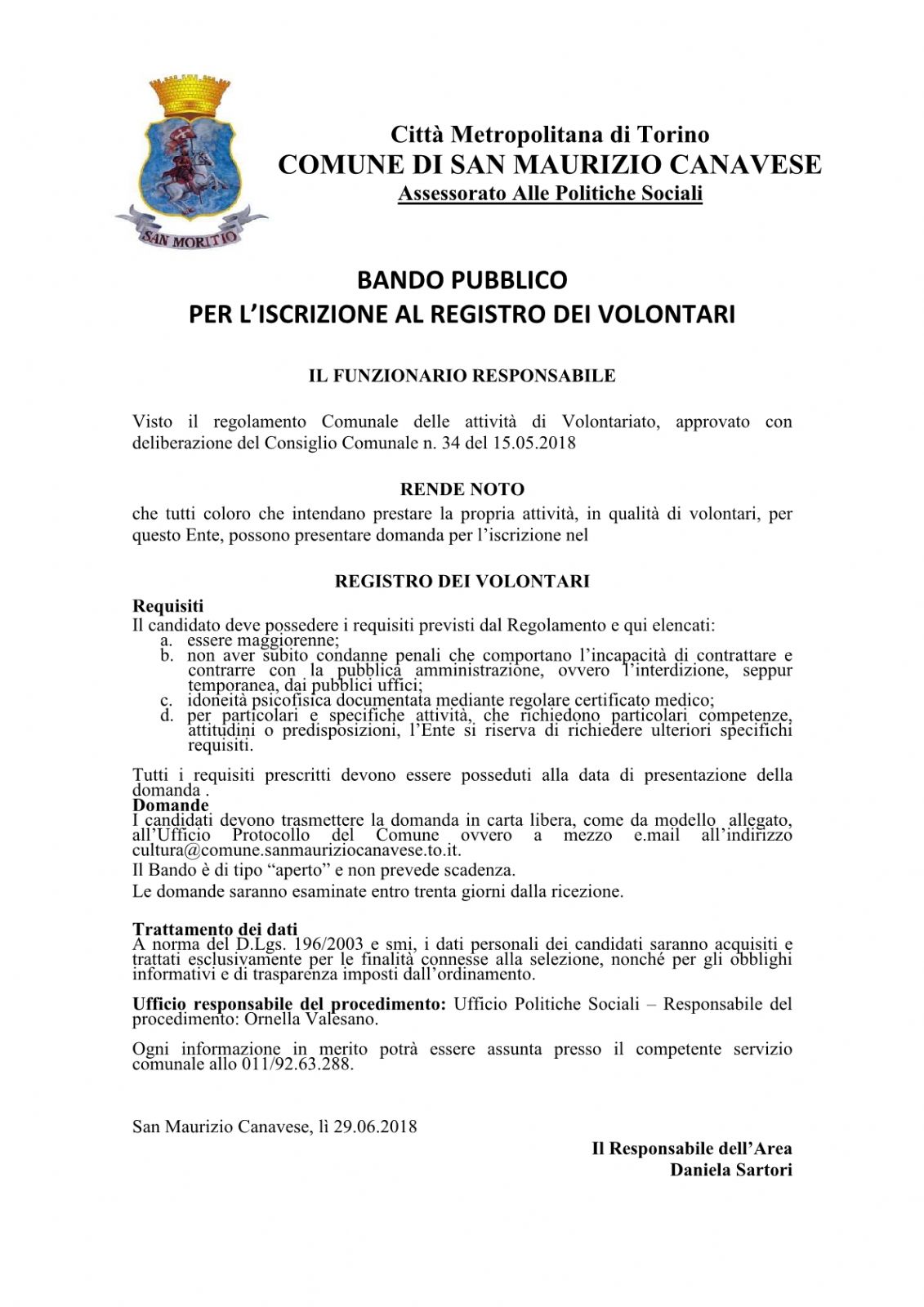 È stato emesso nei giorni scorsi il bando pubblico per l'iscrizione al Registro dei Volontari, aperto a tutti coloro che desiderano prestare attività di volontariato presso il Comune di San Maurizio Canavese. È possibile presentare domanda in carta libera, utilizzando il modello allegato, all'Ufficio Protocollo del Comune oppure tramite e-mail all'indirizzo cultura@comune.sanmauriziocanavese.to.it.