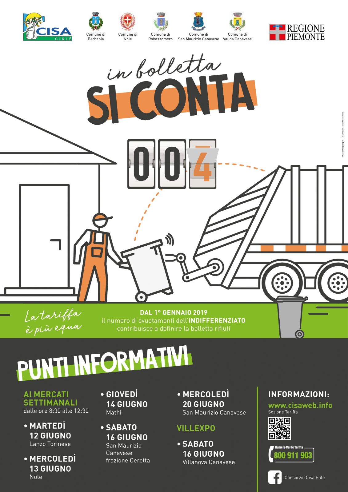 Per illustrare ulteriormente il nuovo sistema e rispondere ad eventuali dubbi dei cittadini, nei prossimi giorni il CISA (Consorzio Intercomunale Servizi per l'Ambiente) sarà presente con appositi punti informativi nei mercati settimanali dei Comuni che dal 2019 passeranno alla tariffazione puntuale. Nel nostro caso, a San Maurizio, il punto informativo CISA sarà presente sabato 16 giugno al mercato di Ceretta e mercoledì 20 giugno al mercato del concentrico.