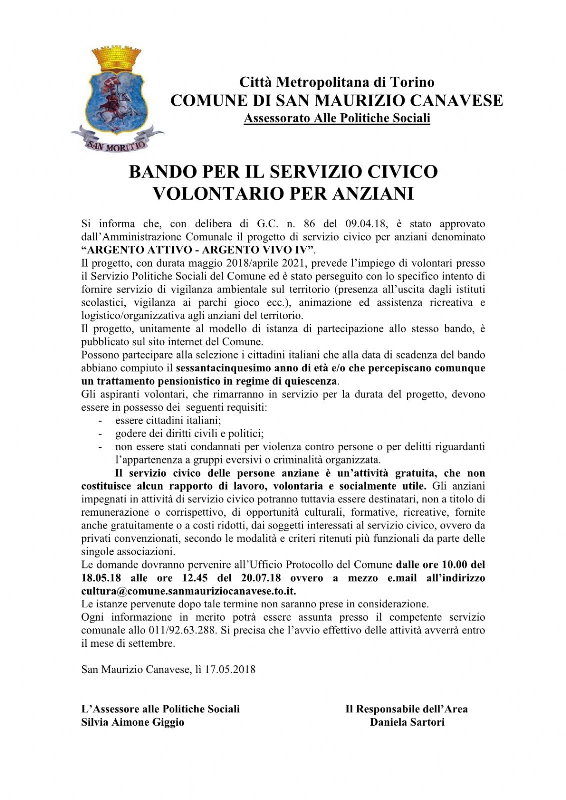 Il progetto, denominato “Argento attivo, argento vivo” e giunto alla quarta edizione, prevede da qui al 2021 l’impiego di volontari presso il Servizio Politiche Sociali del Comune per fornire servizio di vigilanza ambientale per la tutela del patrimonio pubblico, presenza all’uscita dagli istituti scolastici, vigilanza ai parchi gioco, animazione ed assistenza ricreativa e logistico/organizzativa agli anziani del territorio.