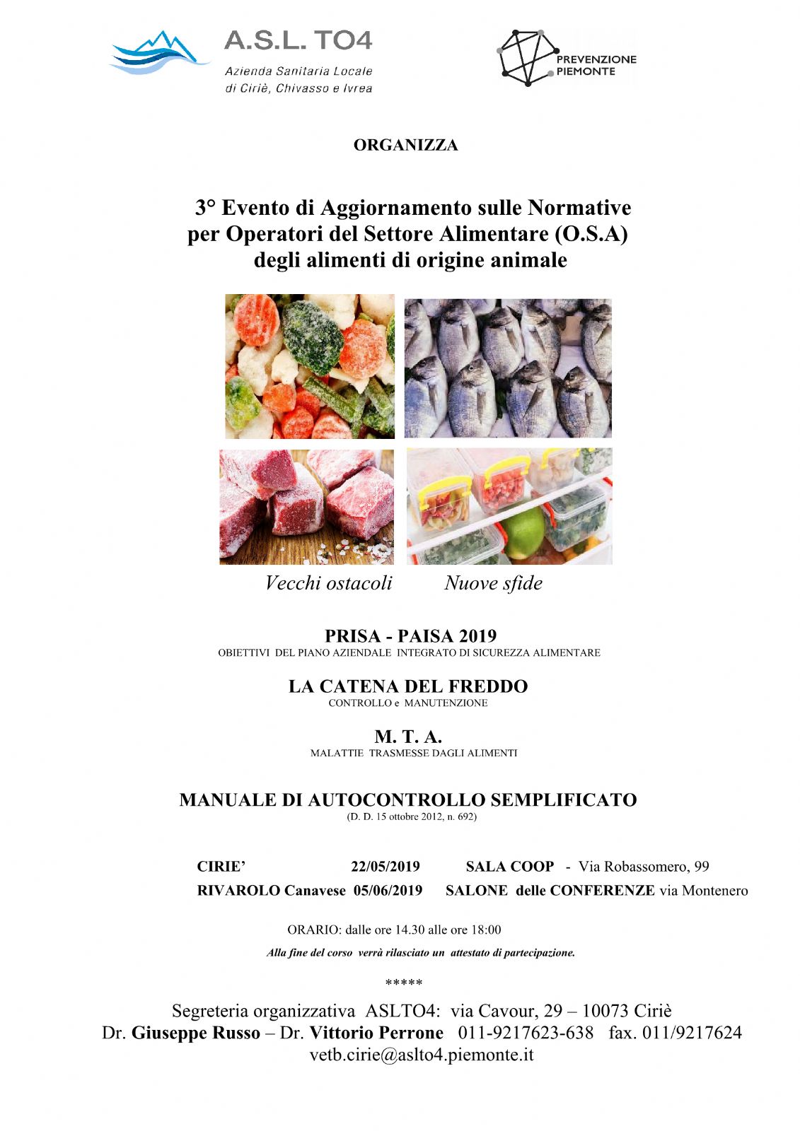 L'Asl TO4 organizza un corso di aggiornamento sulle normative per operatori del settore alimentare. Il primo appuntamento è a Ciriè il 22 maggio (ore 14,30-18) presso la Sala Coop, via Robassomero 99. Per informazioni: tel. 011.9217623-638, vetb.cirie@aslto4.piemonte.to.it