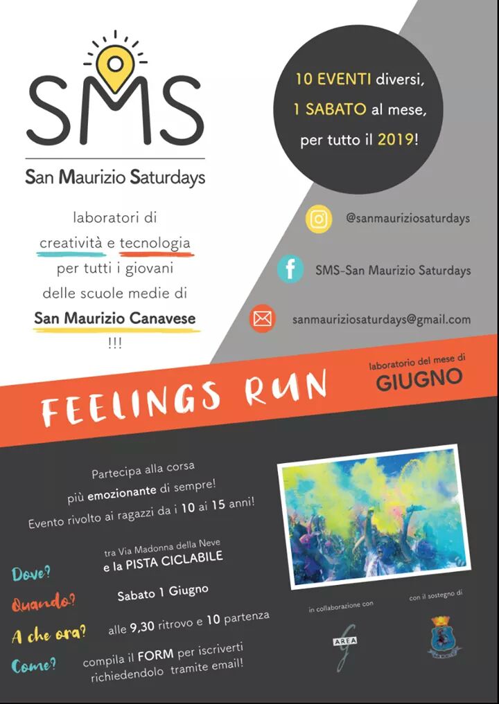 Si chiudono questo lunedì, 27 maggio, le iscrizioni alla Feelings Run, la speciale corsa rivolta ai ragazzi dai 10 ai 15 anni in programma per sabato 1° giugno. La necessità di avere le iscrizioni complete in anticipo è dovuta esclusivamente a ragioni organizzative e assicurative. Quindi, cari giovanissimi concittadini, affrettatevi e partecipate alla corsa più emozionante di sempre. La Feelings Run è organizzata nell'ambito di “SMS SAN MAURIZIO SATURDAYS”, il progetto che il Comune di San Maurizio Canavese dedica ai giovanissimi del paese, avvalendosi delle competenze dell'associazione torinese “Area G Volontari”. Info a sanmauriziosaturdays@gmail.com o su Facebook (SMS - San Maurizio Saturdays) e Instagram (@sanmauriziosaturdays).