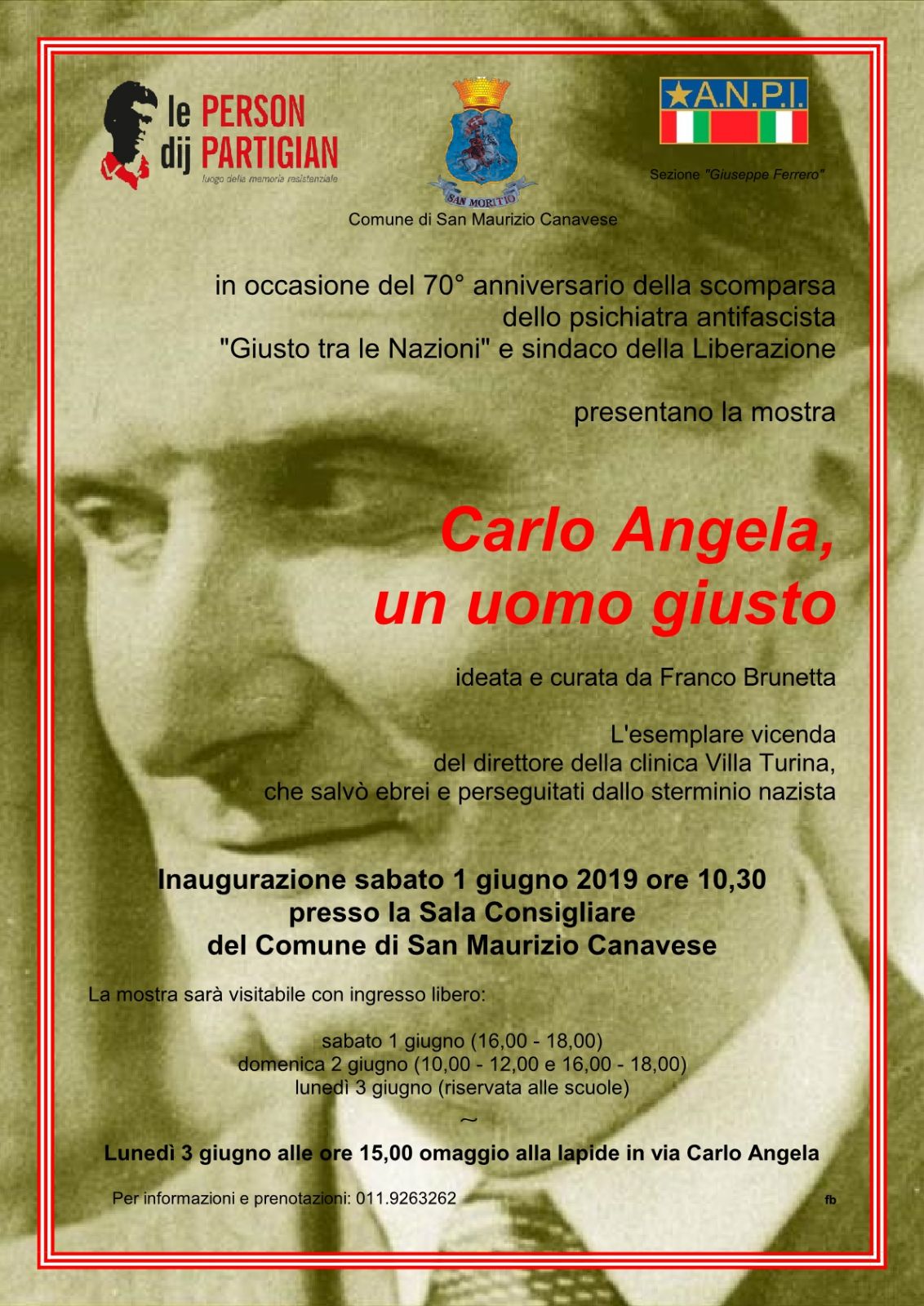 “Carlo Angela, un uomo giusto” è la mostra che il Comune di San Maurizio Canavese e l'Anpi locale organizzano per questo fine settimana in occasione del 70° anniversario della scomparsa del direttore della clinica Villa Turina che salvò ebrei e perseguitati dallo sterminio nazista. L'inaugurazione avverrà sabato 1° giugno alle ore 10,30 nella sala consiliare del municipio. La mostra, ad ingresso libero, sarà visitabile nella stessa giornata di sabato, dalle 16 alle 18, e domenica 2 giugno, dalle 10 alle 12 e dalle 16 alle 18.