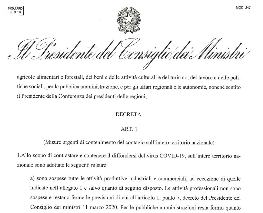 Nella serata di ieri, il Presidente del Consiglio ha firmato il nuovo decreto contenente più stringenti misure di prevenzione contro la diffusione del contagio, con la sospensione della maggior parte delle attività produttive industriali e commerciali.