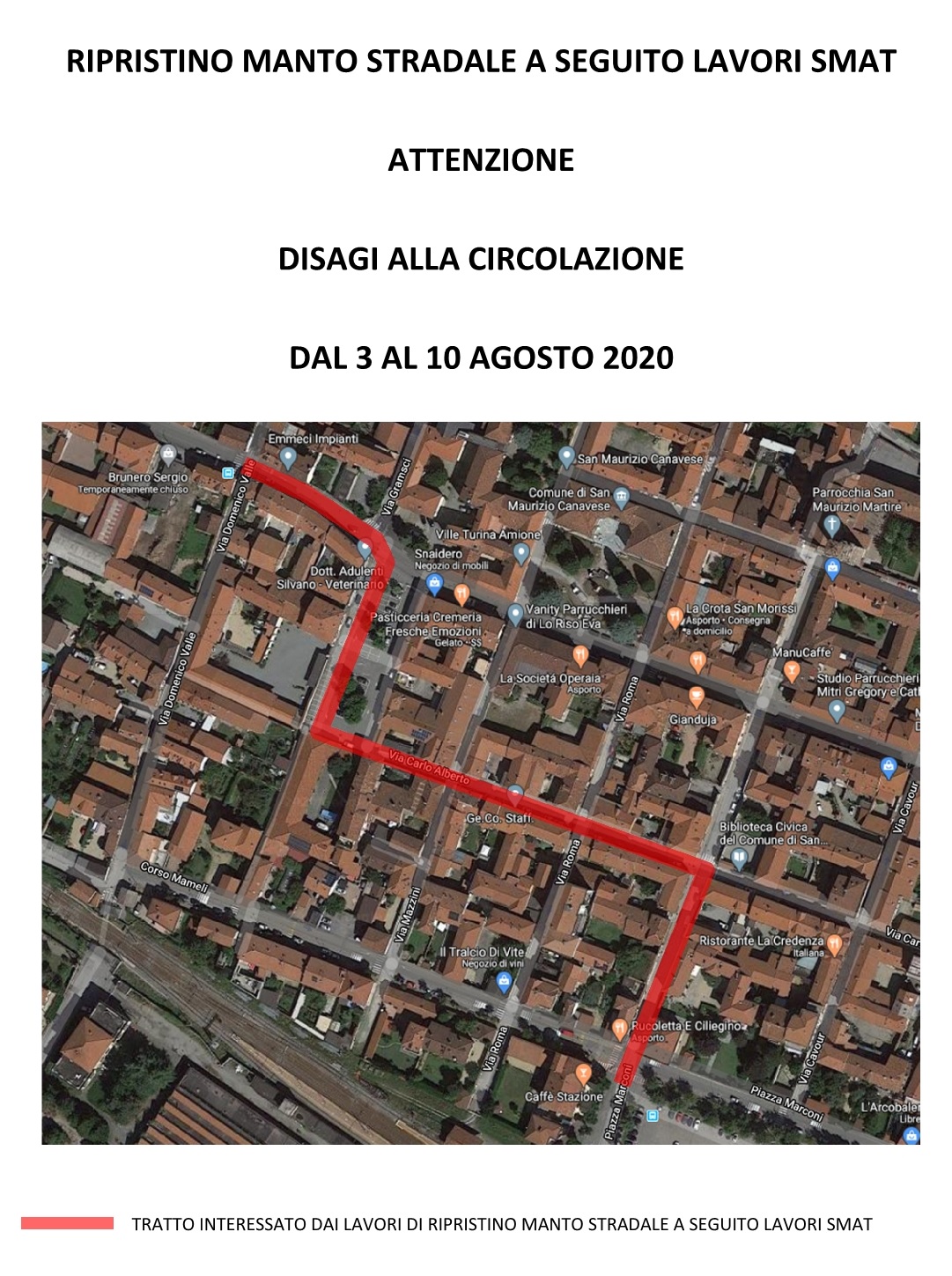 Nell'immagine vedete colorate in rosso le vie del concentrico interessate dai lavori per la sistemazione stradale in seguito ai lavori Smat: si tratta di via Matteotti (tra via Valle e Via Gramsci), piazza Statuto, via Carlo Alberto fino all'incrocio con via Olivari e la stessa via Olivari fino a piazza Marconi.