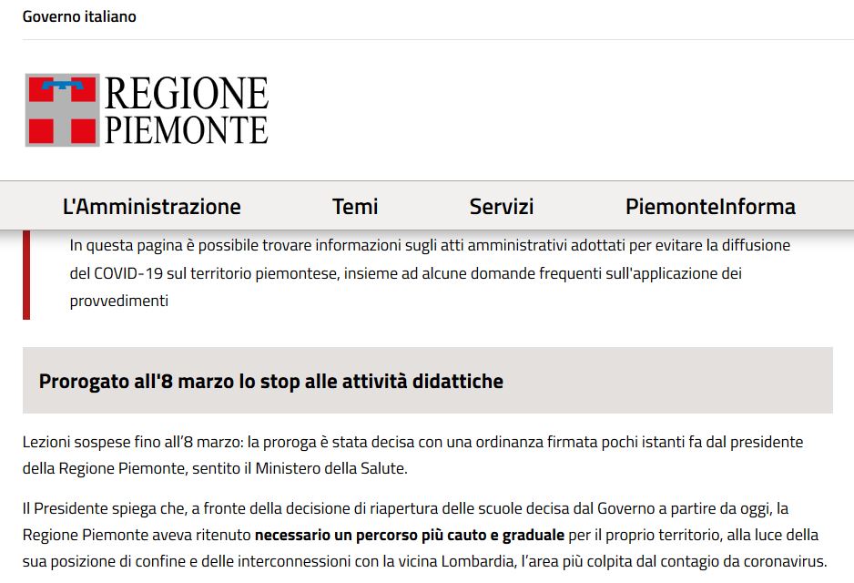 Contrariamente a quanto comunicato l'altro ieri dalla Regione, le lezioni in tutte le scuole del Piemonte riprenderanno non mercoledì 3 marzo bensì lunedì 9 marzo, fatte salve ulteriori comunicazioni. In allegato, l'ordinanza firmata poco fa dal presidente della Regione Piemonte, Alberto Cirio.