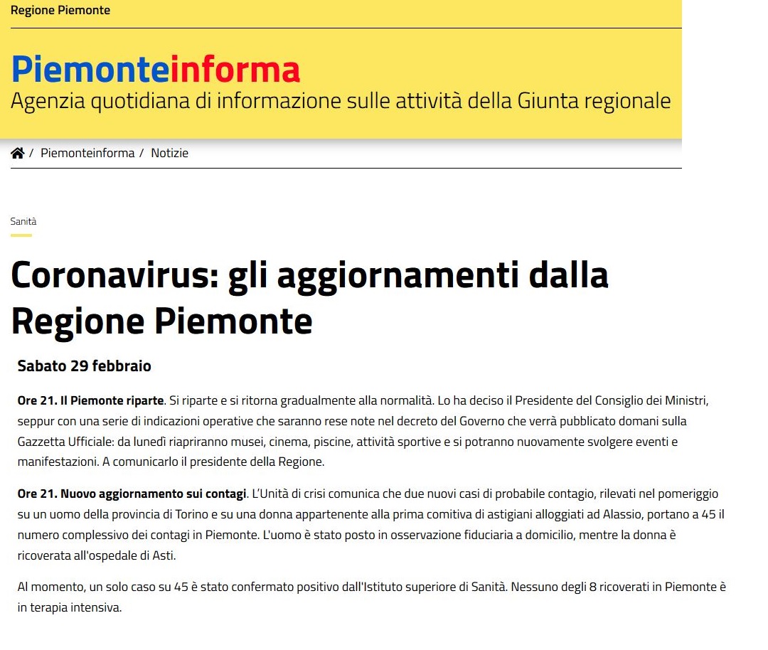 Su tutto il territorio regionale - dunque anche nel nostro Comune - le lezioni scolastiche riprenderanno mercoledì 4 marzo. Lo ha deciso la Regione Piemonte, di concerto con l'Ufficio Scolastico Regionale, dopo il confronto con il Governo nel pomeriggio di oggi.
