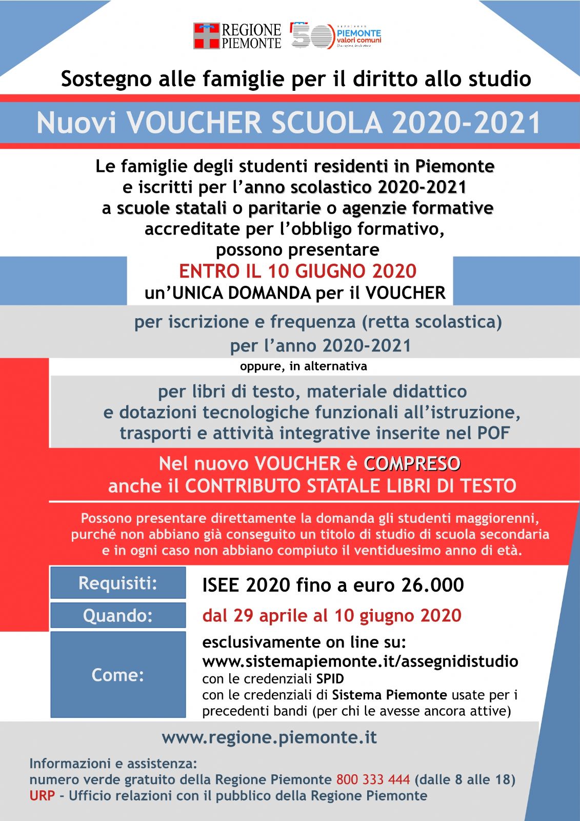 Le famiglie degli studenti, residenti in Piemonte e iscritti per l'anno scolastico 2020-2021 a scuole statali o paritarie o agenzie formative accreditate per l'obbligo formativo possono richiedere il Voucher per iscrizione e frequenza (retta scolastica) per l'anno scolastico 2020/2021 oppure, in alternativa, per libri di testo, materiale didattico e dotazioni tecnologiche funzionali all'istruzione, trasporti e attività integrative inserite nel POF.