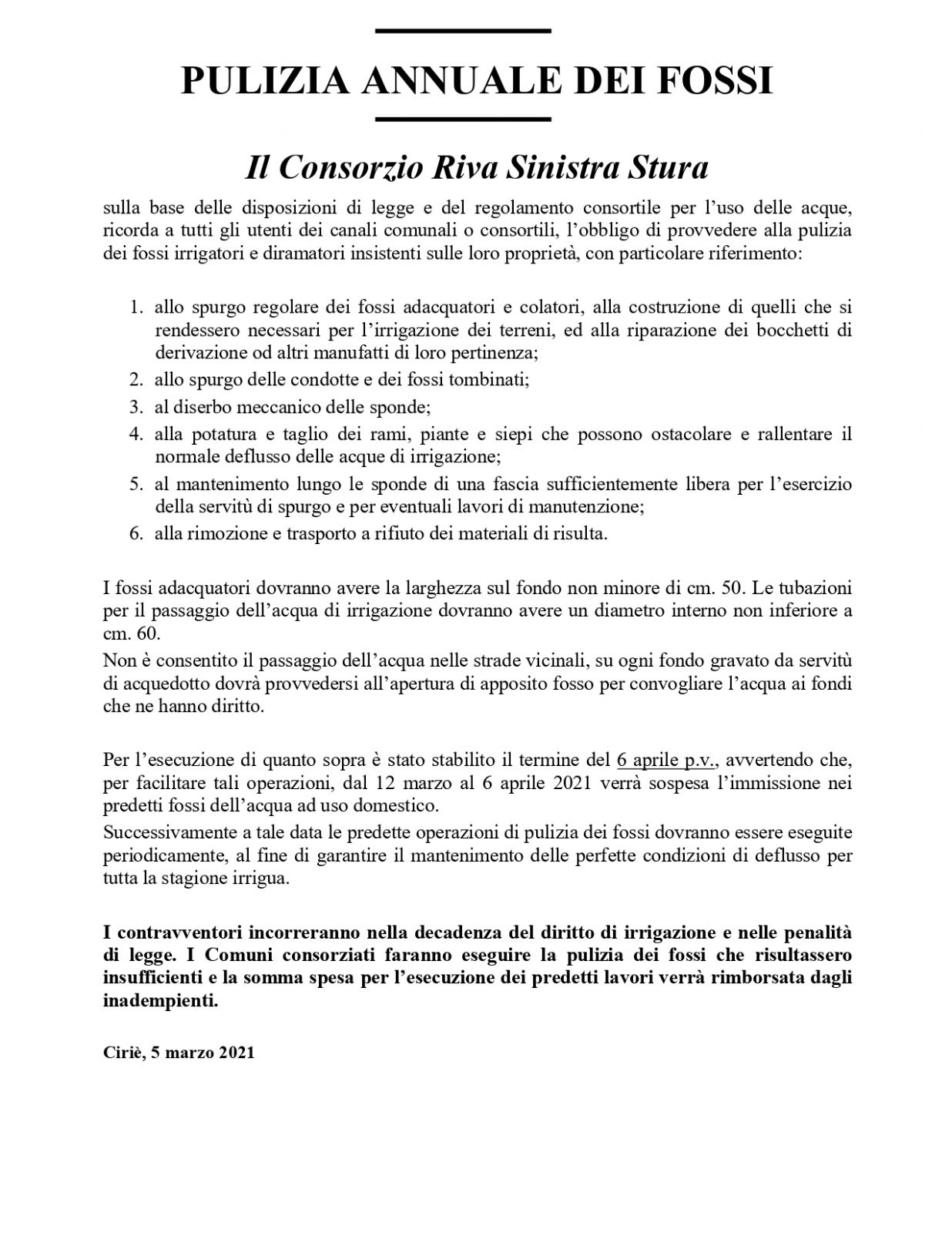 Il Consorzio Riva Sinistra Stura ricorda a tutti gli utenti dei canali comunali e consortili tempi e modalità per la pulizia annuale dei fossi irrigatori e diramatori che insistono sulle rispettive proprietà.