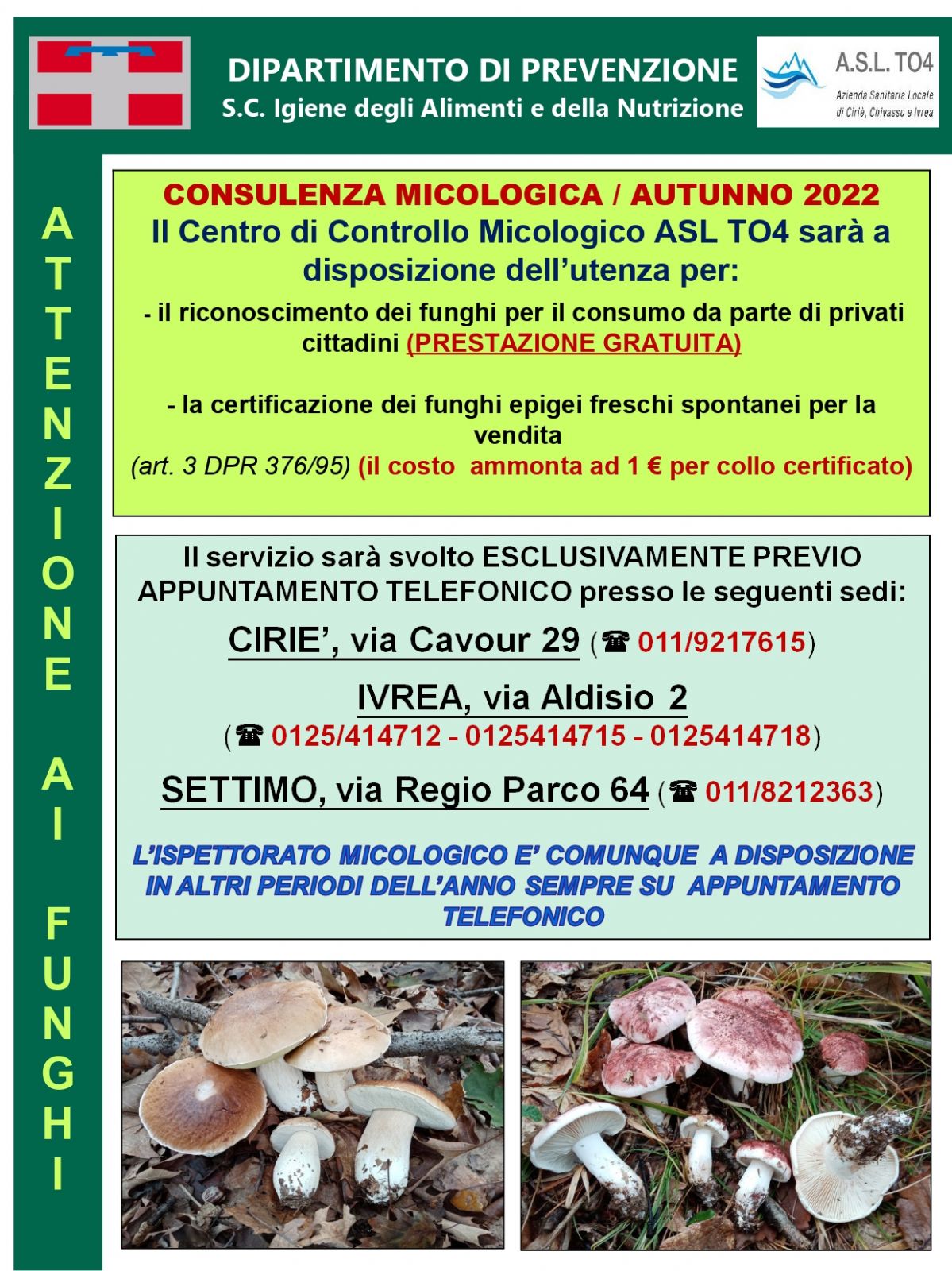 Anche quest'anno il Centro di Controllo Micologico dell'ASL TO4 è a disposizione di tutti i cittadini per consulenze gratuite sui funghi raccolti, oltre che per la certificazione dei funghi epigei freschi spontanei per la vendita (in quest'ultimo caso al costo di un euro a collo).