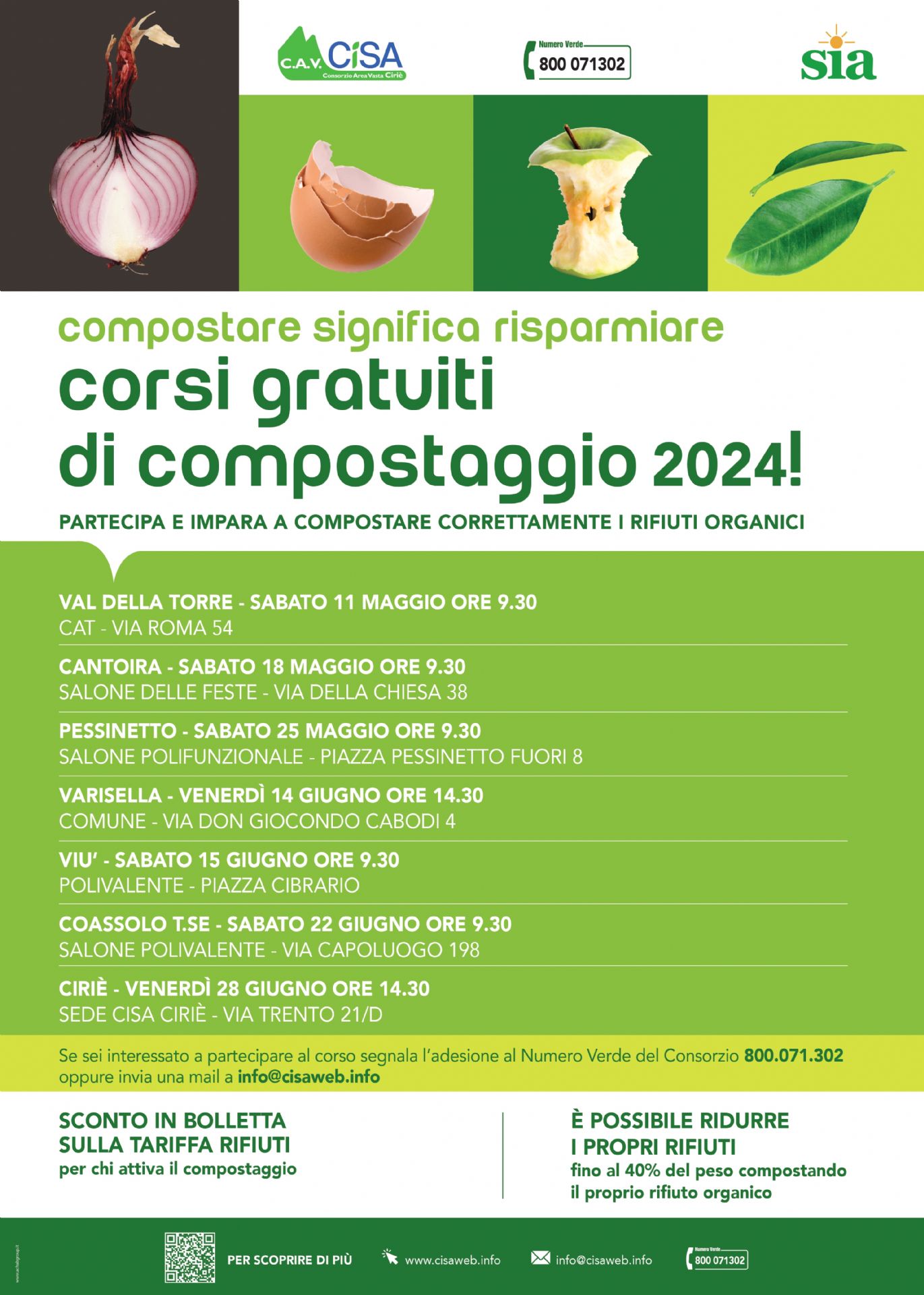 CISA, Consorzio Intercomunale di Servizi per l’Ambiente, ha pubblicato sul proprio sito internet il calendario dei corsi gratuiti di compostaggio in programma nel 2024. Per informazioni tel 800.071.302