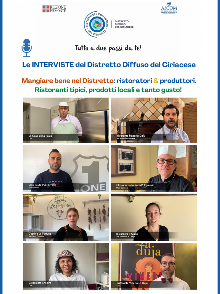 Il Distretto Diffuso del Ciriacese ha pubblicato le prime prime videointerviste a ristoratori e produttori di eccellenze gastronomiche locali: https://www.distrettodiffusodelciriacese.it/post/le-interviste-del-distretto-diffuso-del-ciriacese-i-ristoratori-e-i-produttori-di-eccellenze-gastro