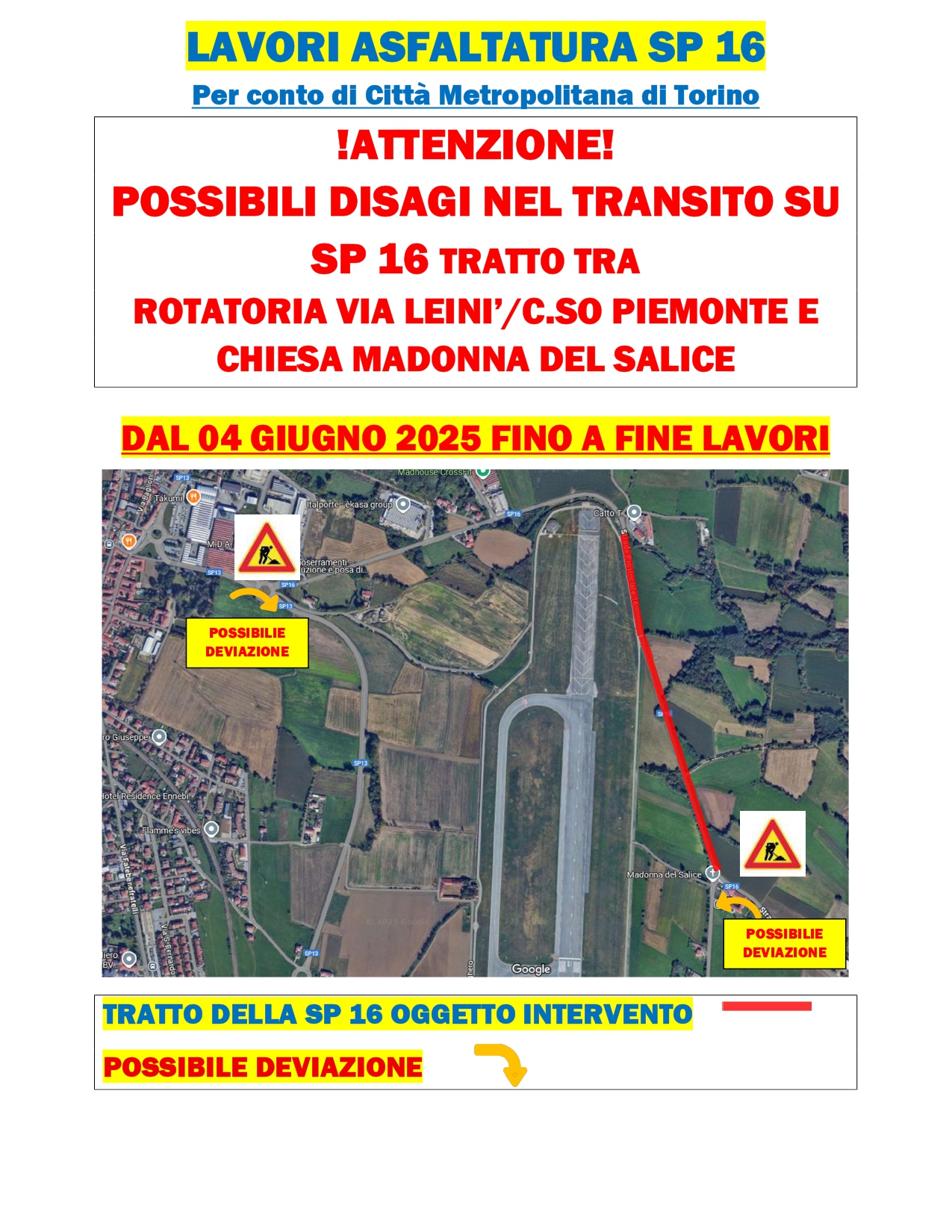 Domani, mercoledì 4 giugno, partiranno i lavori di Città Metropolitana di Torino per l'asfaltatura della Sp 16 nel tratto compreso indicativamente fra il punto terminale della pista aeroportuale e la cappella della Madonna del Salice a Malanghero. Vi invitiamo a prestare la massima attenzione alla segnaletica e a utilizzare i percorsi alternativi indicati.