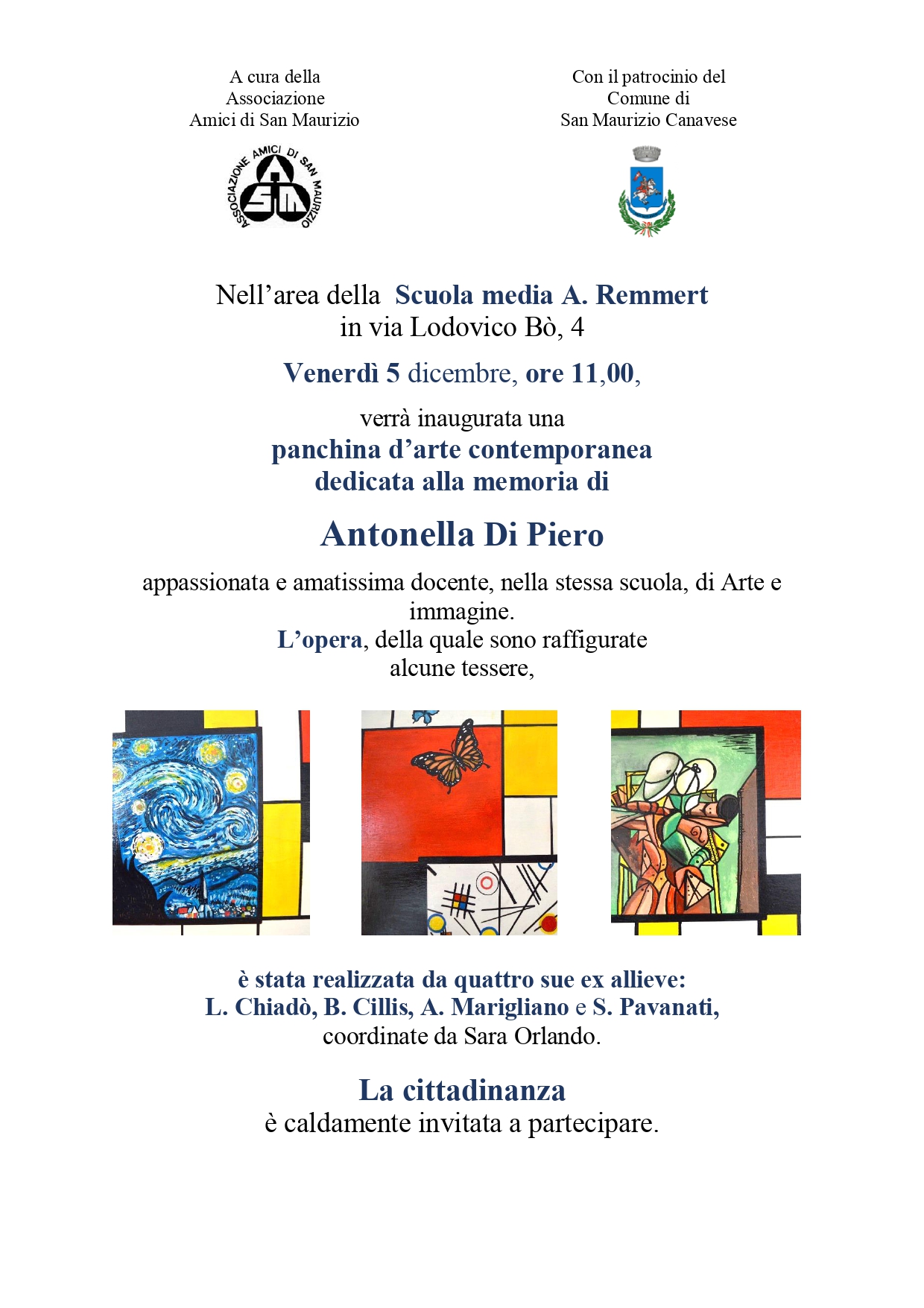 Dopodomani, venerdì 5 dicembre, nel cortile della scuola secondaria di primo grado "Andrea Remmert" sarà inaugurata una panchina d'arte contemporanea dedicata alla memoria della professoressa Antonella Di Piero e realizzata da alcune sue ex allieve. L'appuntamento è alle ore 11 in via Lodovico Bò 4 ed è aperto a tutta la cittadinanza.