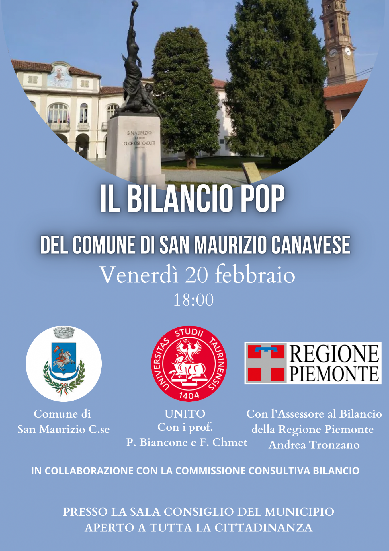 Venerdì 20 febbraio alle ore 18 nella sala consiliare del municipio sarà presentato alla popolazione e alla stampa il Bilancio POP del Comune di San Maurizio Canavese.