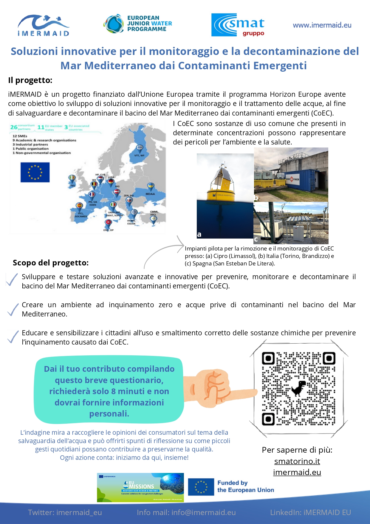 Per il progetto iMERMAID - finanziato dall'Unione Europea nell'ambito del programma Horizon Europe per lo sviluppo e la sperimentazione di soluzioni innovative per la prevenzione, il monitoraggio e la decontaminazione del bacino del Mar Mediterraneo dai contaminanti emergenti (CoEC) - SMAT ci chiede di compilare un breve questionario sull'uso corretto e sullo smaltimento responsabile delle sostanze chimiche. Bastano pochi minuti e non è necessario fornire informazioni personali. Il link al quale troviamo il questionario è https://forms.gle/TkW3y6KYdAybYivD7