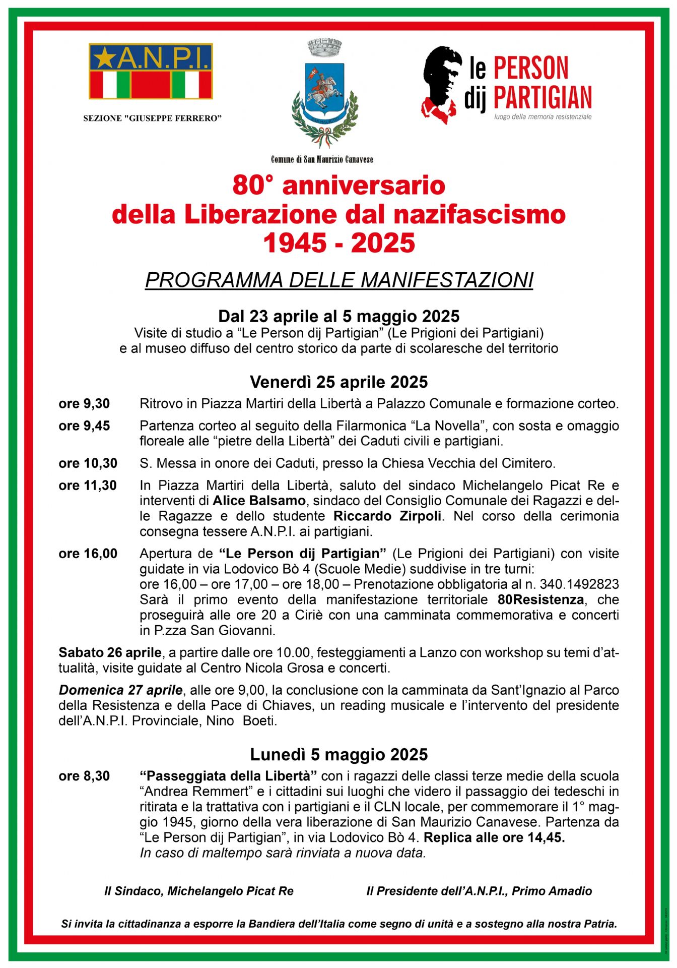 Inoltre, lunedì 5 maggio, “Passeggiata della Libertà” insieme ai ragazzi di terza media e ai cittadini sui luoghi che videro il passaggio dei tedeschi in ritirata e la trattativa con i partigiani e il CLN locale, per commemorare il 1° maggio 1945, giorno della vera liberazione di San Maurizio Canavese. Partenza dalle "Person dij Partigian".
