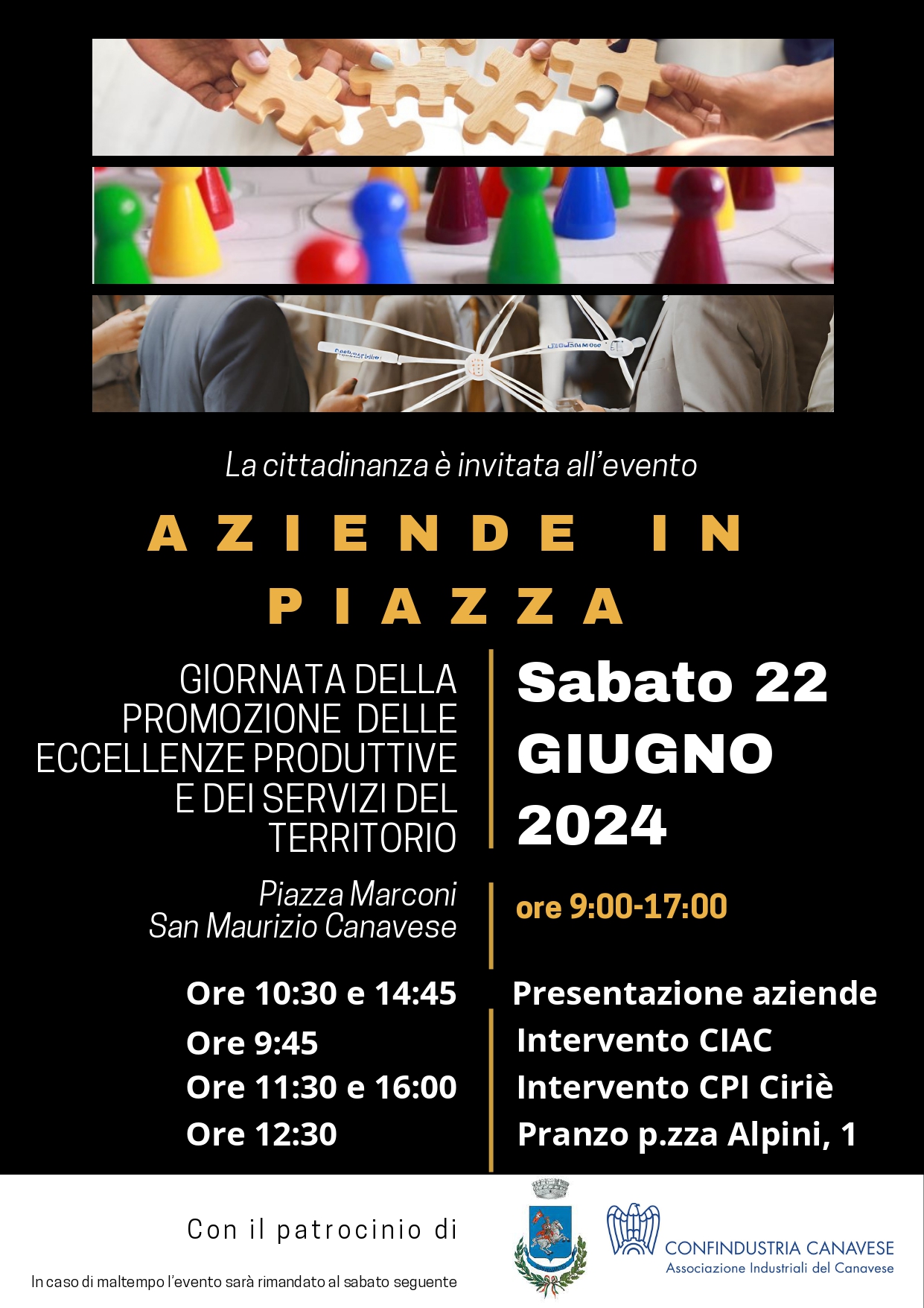 Si chiama "Aziende in piazza" l'evento organizzato dal Servizio comunale Attività Produttive di San Maurizio Canavese per sabato 22 giugno. Una speciale giornata dedicata alla promozione delle eccellenze produttive e dei servizi del territorio: dalle 9 alle 17 piazza Marconi si trasformerà in una grande vetrina per tutte le imprese del territorio che potranno presentare le rispettive realtà alla cittadinanza. Un'occasione per cogliere le esigenze specifiche delle realtà economiche locali e per "fare sistema" di fronte alle sfide sempre più impegnative del mondo economico e produttivo.