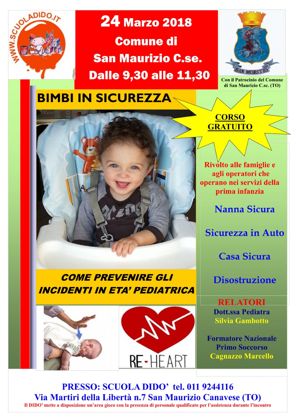 Domani mattina, sabato 24 marzo dalle 9.30 alle 11.30, presso la Scuola Didò (via Martiri della Libertà, 7) si terrà un corso-incontro sulla sicurezza dei bambini: "Come prevenire gli incidenti in età pediatrica". L'evento, patrocinato dal Comune di San Maurizio Canavese, è gratuito e rivolto alle famiglie e agli operatori dei servizi per la prima infanzia. Parteciperanno la Dottoressa Silvia Gambotto, medico pediatra, e Marcello Cagnazzo, formatore nazionale di primo soccorso.
