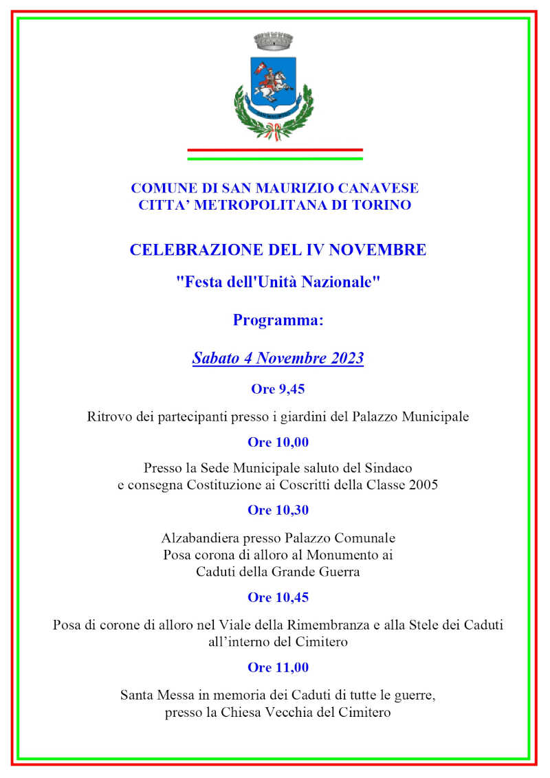 Sabato 4 novembre il nostro Comune solennizzerà il giorno dell'Unità Nazionale, ricordando i propri Caduti in guerra e celebrando i valori della pace e dell'uguaglianza.