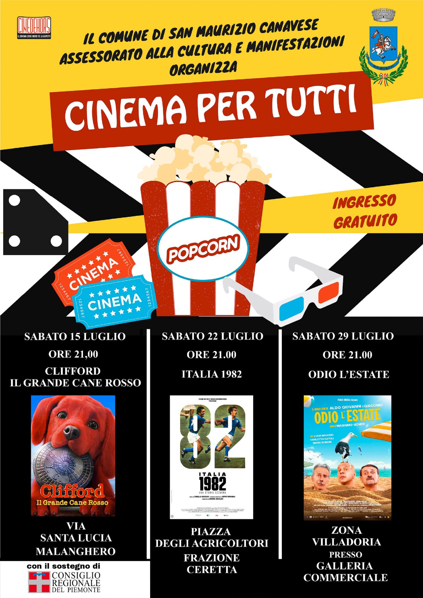 Continua la grande stagione dedicata alla cultura e agli spettacoli a San Maurizio Canavese. Dopo le ricche rassegne che ci hanno accompagnato nei mesi di maggio e giugno, è l'ora del cinema all'aperto. La rassegna "Cinema per tutti", organizzata dall'assessorato alla Cultura e alle Manifestazioni, propone tre appuntamenti da non perdere nel mese di luglio: