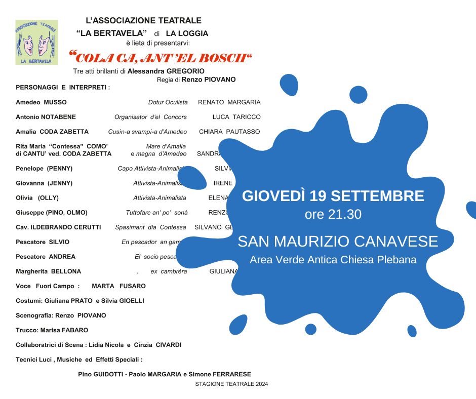 Giovedì 19 settembre alle 21.30, in occasione della festa patronale, nel padiglione antistante l'Antica Chiesa Plebana la Compagnia teatrale “La Bertavela” di La Loggia presenta la commedia dialettale “Colaca, ant’el bosch”, a cura della locale sezione ADMO e in collaborazione con il Comune di San Maurizio Canavese.