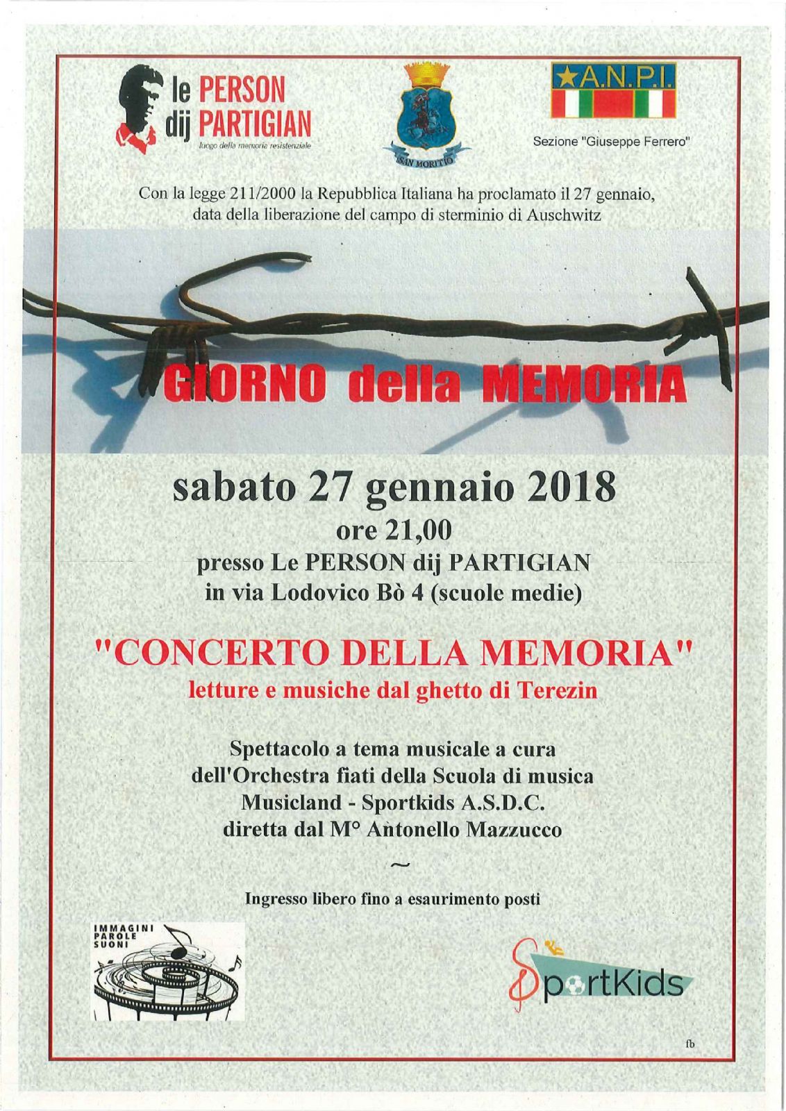 Sabato 27 gennaio, Giorno della Memoria, alle ore 21 presso le Person dij Partigian (via Bo, 4) avrà luogo il "Concerto della Memoria - Letture e musiche dal ghetto di Terezin", spettacolo a tema musicale a cura dell'orchestra fiati della scuola di musica Musicland - Sportkids Asdc.