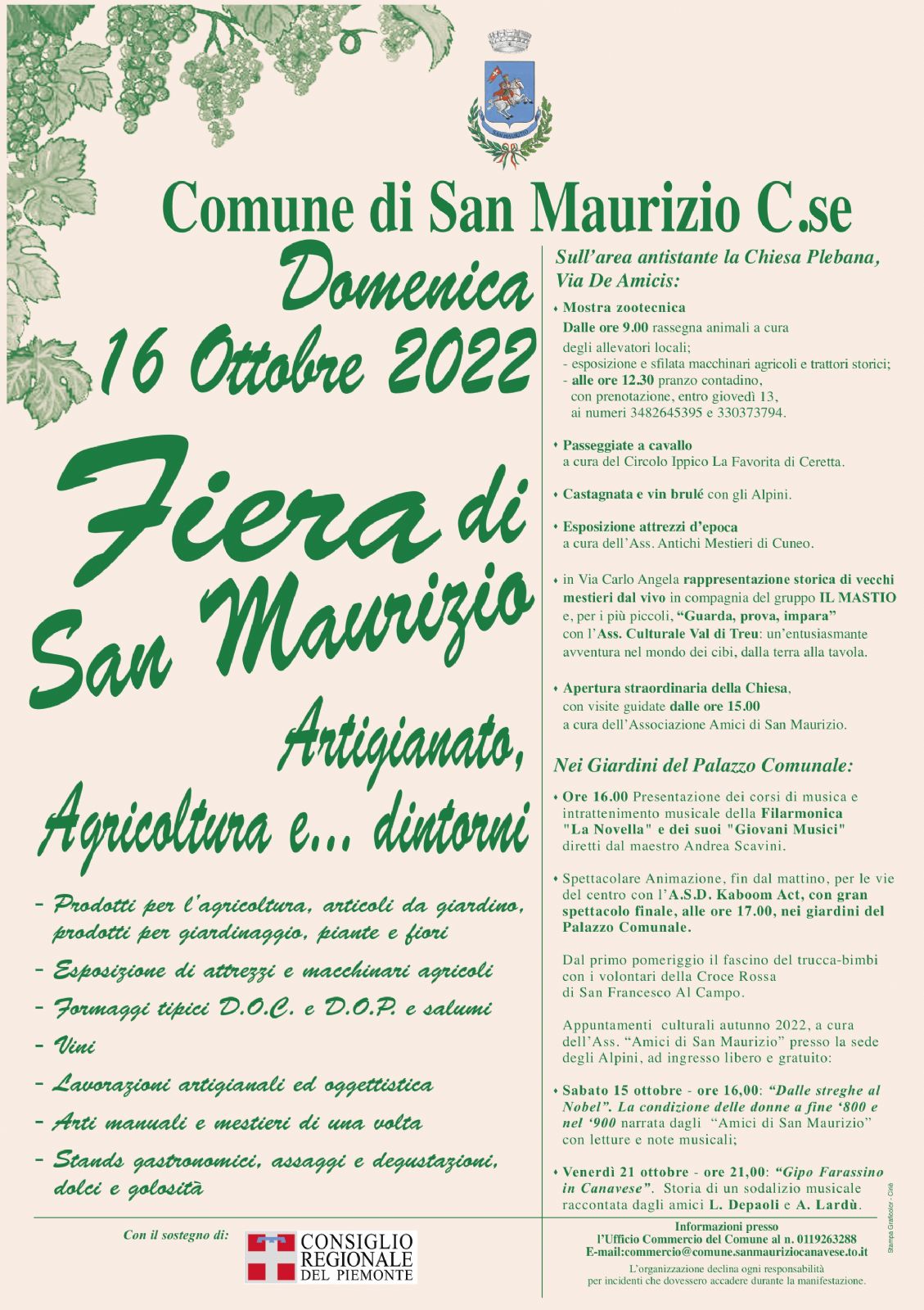 Domenica 16 ottobre sarà il giorno della Fiera "Artigianato, Agricoltura e dintorni", la grande sagra d'autunno organizzata ogni anno dal Comune di San Maurizio Canavese, con il sostegno della Regione Piemonte. Gli appuntamenti avranno inizio fin dal primo mattino e copriranno l'intera domenica.