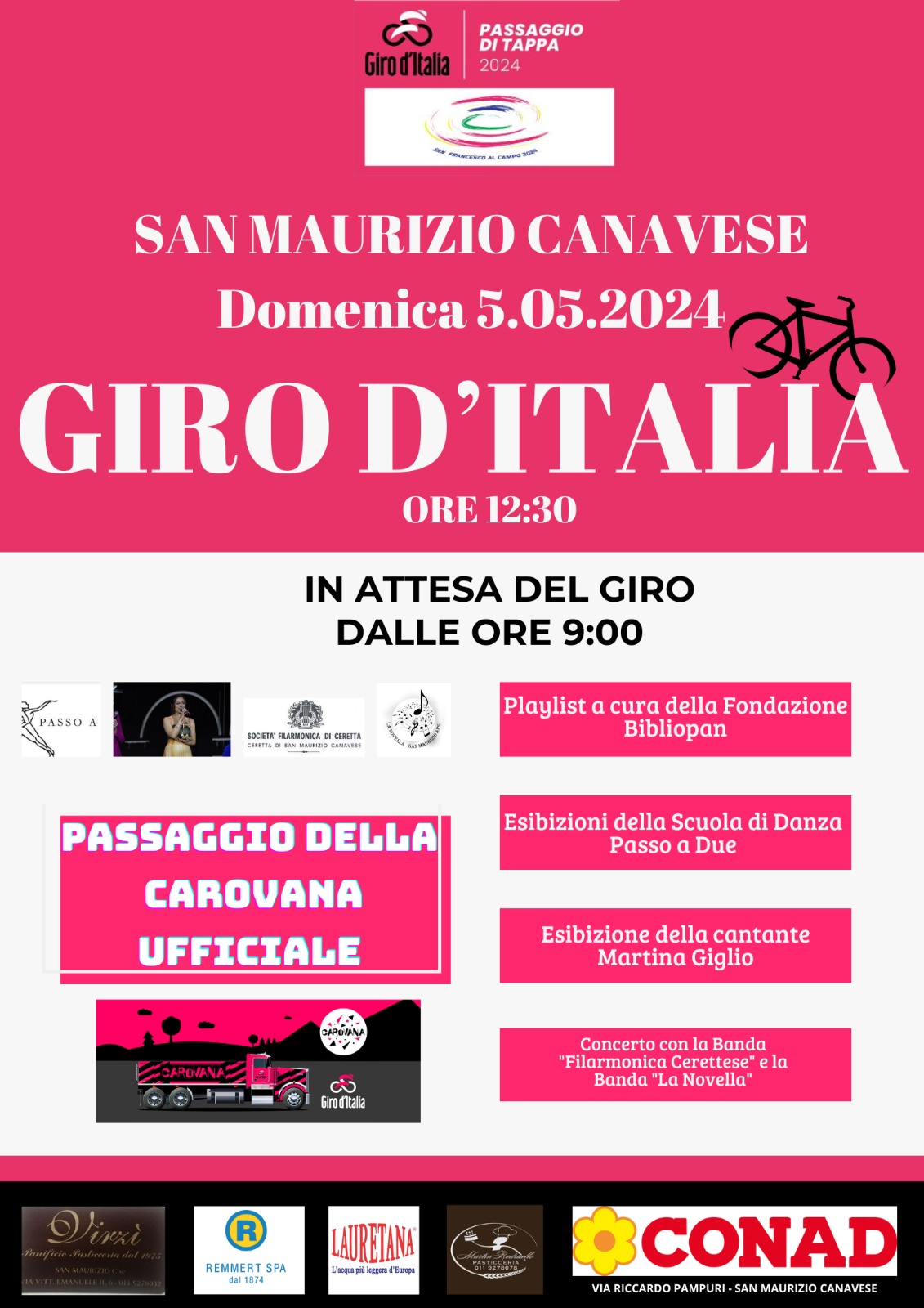 Domenica 5 maggio, tutti in strada ad aspettare il passaggio del Giro d'Italia. A partire dalle 9, playlist con la Fondazione Bibliopan, esibizione della scuola di danza Passo a Due e della cantante Martina Giglio, concerto della Filamonica Cerettese e della Novella. Fino al momento del passaggio della Corsa Rosa, previsto intorno alle 13.