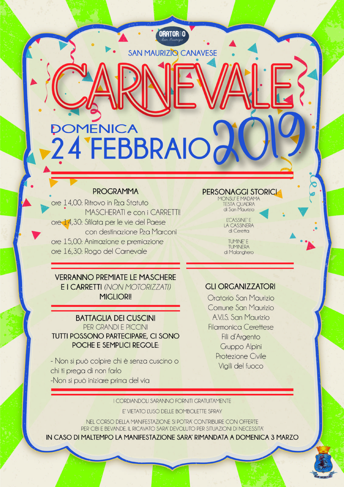 Domenica 24 febbraio, appuntamento con il tradizionale Carnevale in piazza a San Maurizio. La manifestazione è organizzata da Oratorio di San Maurizio Martire, Comune di San Maurizio Canavese, Avis, Filarmonica Cerettese, Fili d'Argento, Alpini, Protezione Civile, Vigili del Fuoco. Maschere e carretti si ritroveranno alle ore 14 in piazza Statuto.