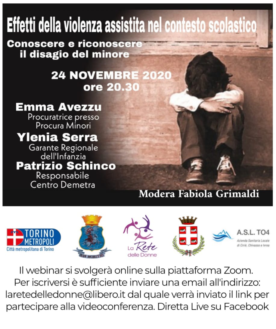 La Rete delle Donne organizza un incontro formativo in live streaming dedicato agli insegnanti e agli educatori. Il webinar, sull'argomento "Effetti della violenza assistita nel contesto scolastico - Conoscere e riconoscere il disagio del minore", si svolgerà martedì 24 novembre alle 20,30 sulla piattaforma Zoom.