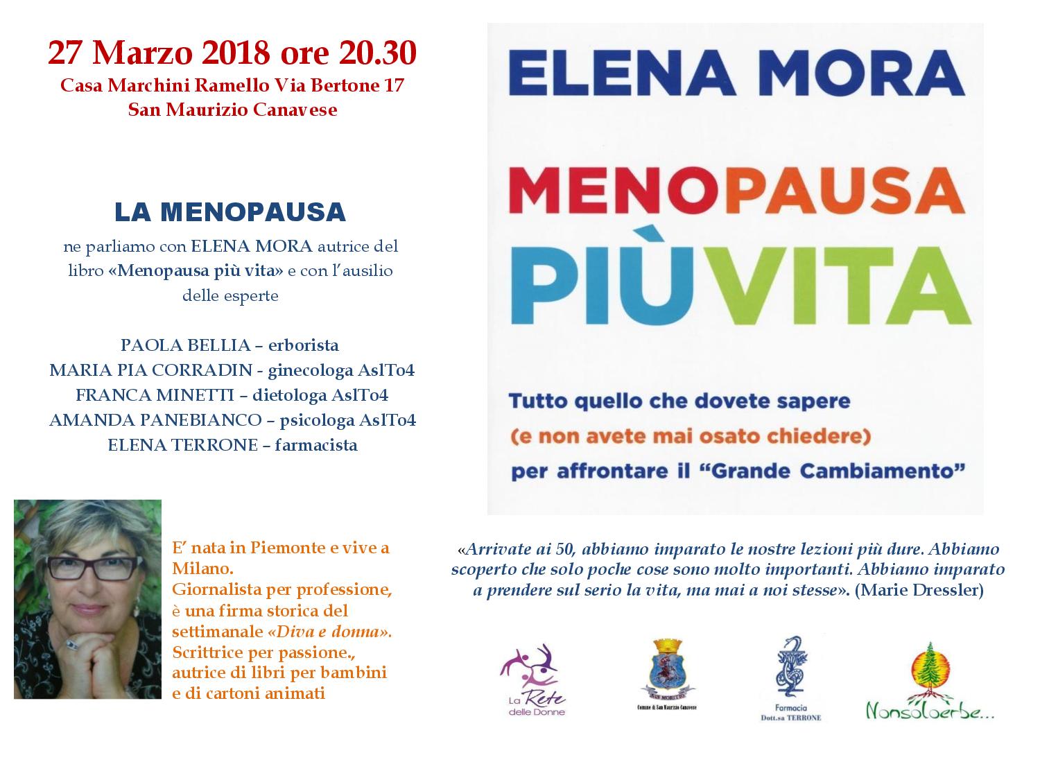 Martedì 27 marzo, la Rete delle Donne, con il patrocinio del Comune del Comune di San Maurizio Canavese, organizza una serata sul tema della menopausa. L'argomento sarà affrontato e approfondito insieme a Elena Mora, giornalista e scrittrice, autrice del libro “Menopausa più vita”. Offriranno il loro contributo anche Paola Bellia, erborista; Maria Pia Corradin, ginecologa; Franca Minetti, dietologa; Amanda Panebianco, psicologa; Elena Terrone, farmacista. L'appuntamento è alle ore 20,30 a Casa Marchini Ramello (via Bertone, 17). La serata naturalmente è aperta a tutti.