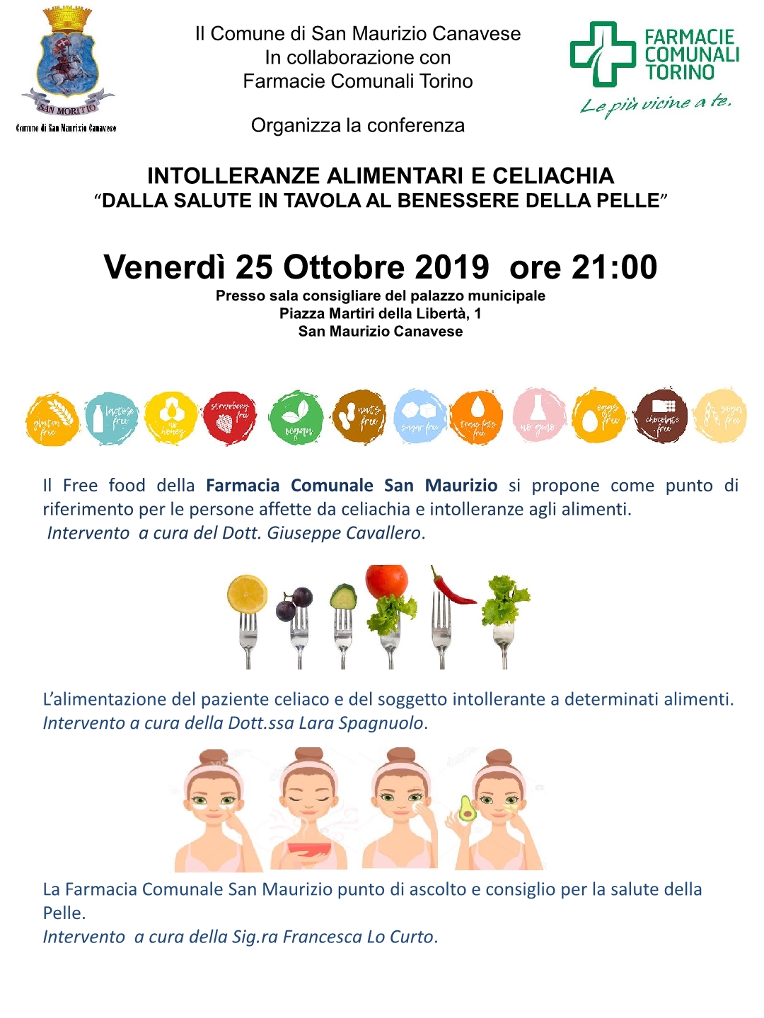 “Intolleranze alimentari e celiachia. Dalla salute in tavola al benessere della pelle” è il tema della conferenza organizzata dal Comune di San Maurizio Canavese in collaborazione con Farmacie Comunali Torino, la società che gestisce la Farmacia Comunale di Ceretta. L'appuntamento è venerdì 25 ottobre, alle ore 21, nella Sala consiliare del municipio. La serata, naturalmente, è aperta a tutti i cittadini e ci offrirà l'opportunità di conoscere meglio le problematiche legate all'intolleranza alimentare e alla celiachia, affrontandole con la corretta alimentazione, e di ricevere giusti consigli per la salute della pelle.
